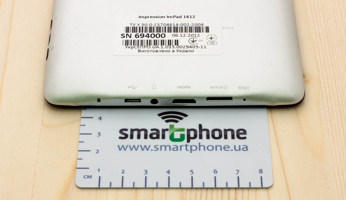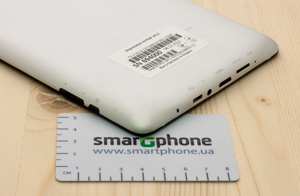 К Impression ImPad 1412 можно подключить наушники, для них на нижнем торце есть 3,5 мм вход. Для зарядки батареи и подключения планшета к ПК предназначен разъем micro-USB. Помимо этого, есть вход для подключения mini-HDMI кабеля и слот для карт microSD максимальным объемом до 32ГБ.