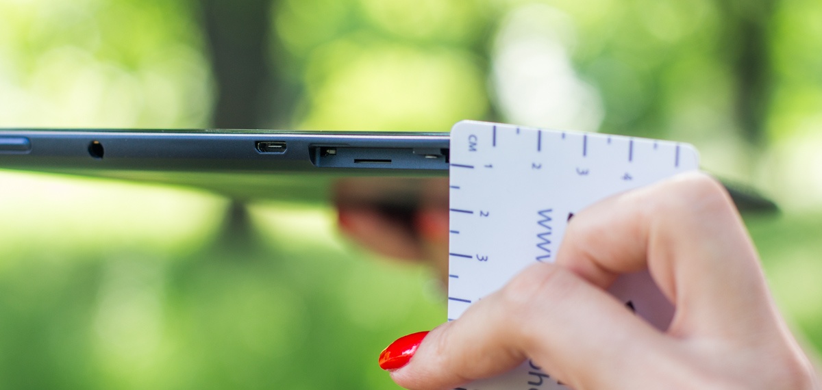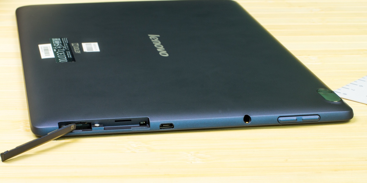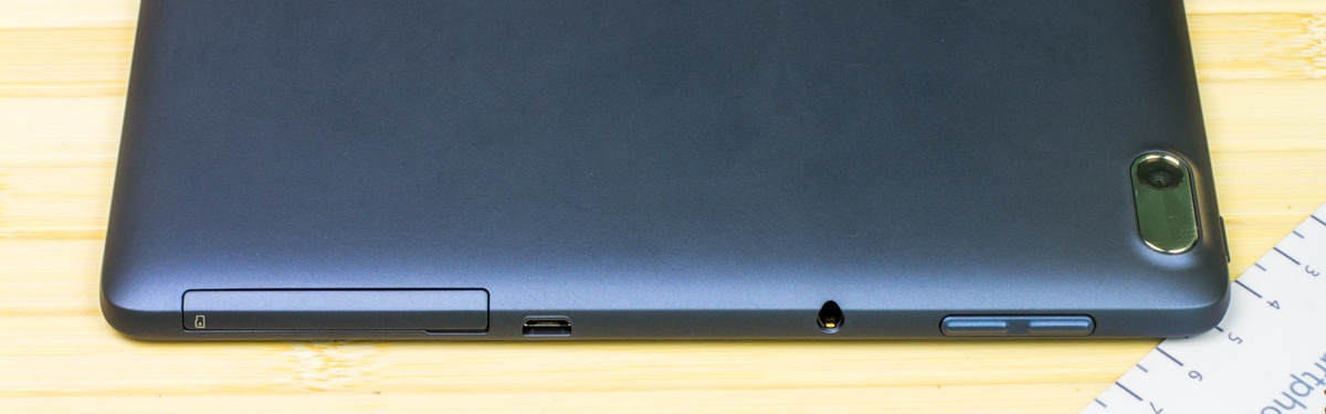 Левая боковая грань планшета отдана под 3,5 мм аудиоразъем, спаренную клавишу регулировки громкости звука, разъем microUSB, а также слот для карты памяти MicroSD, прикрытый заглушкой.