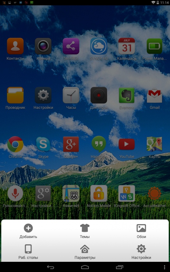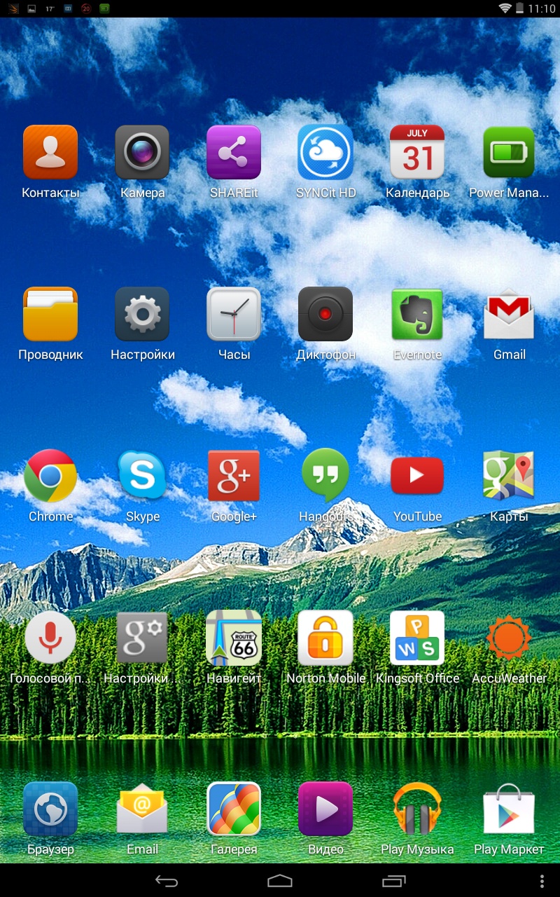Производитель установил на планшет немало софта. Среди наиболее интересных программ: Power Managment, антивирус Norton Mobile Security, а также программа для чтения «Книги» и передачи файлов с одного телефона на другой SHAREit, офисный пакет Kingsoft Office, ROUTE 66 Навигейт и многие другие.