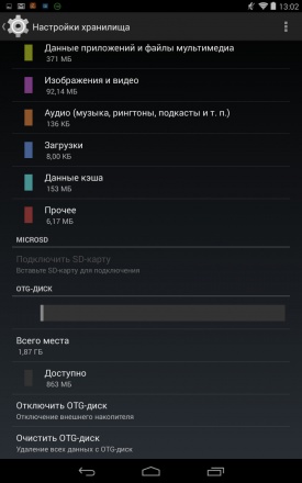 «На борту» Lenovo TAB A8 16 ГБ встроенной памяти, из которых в распоряжении пользователя порядка 14,5 ГБ. Предусмотрена возможность расширения с помощью карт памяти формата microSD максимальным объемом до 32 ГБ, а также посредством USB-носителя. Последнее проверила с помощью USB-флешки.