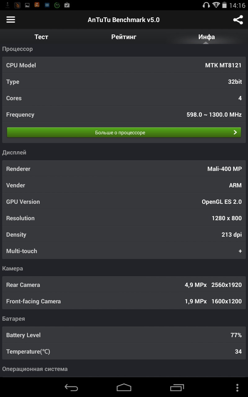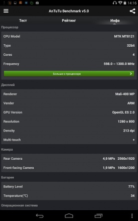 «Каменным сердцем» девайса выступает 32-битный 4-ядерный процессор MediaTek MTK 8121 с максимальной тактовой частотой 1,3 ГГц и графикой Mali-400MP.