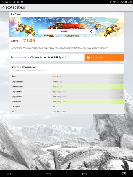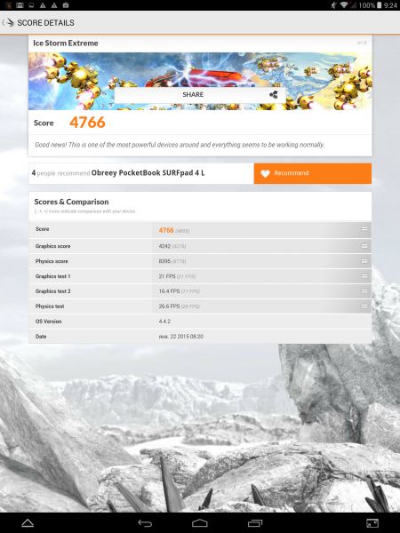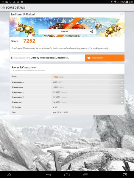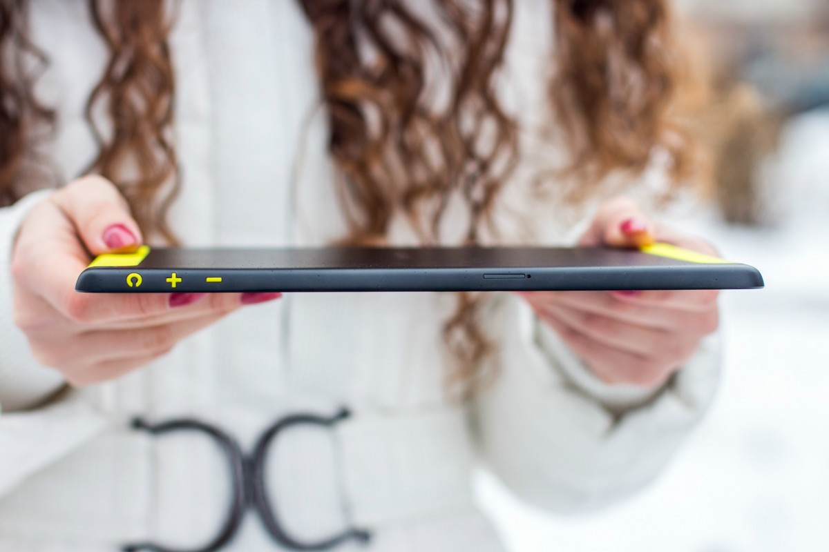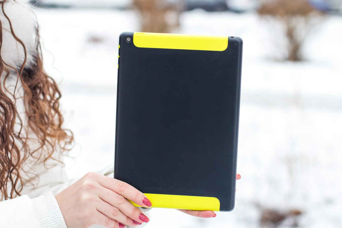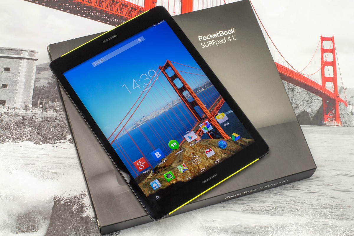 Обзор планшета PocketBook SURFpad 4 L – Retina-подобный экран и 8 ядер!Самая большая модель в портфолио планшетов PocketBook SURFpad четвертого поколения — 9.7-дюймовый SURFpad 4 L c Retina-подобным дисплеем, 8-ядерным процессором, 2 ГБ ОЗУ и с 3G. Его корпус изготовлен из стекла и металла, анфас украшают два стереодинамика, а тыл 8Мп камера. А вот насколько интересным получилось такое сочетание и стоит ли девайс тех $340, которые за него просит производитель, я расскажу далее. Лень читать текстовый обзор? Смотрите видео-обзор...КомплектацияУстройство поставляется в большой тонкой коробке черного цвета с изображением SURFpad 4 L на лицевой стороне и кратким списком его технических характеристик на пяти языках на обороте. Внутри упаковки находится сам планшет, кабель microUSB-USB, адаптер зарядного устройства, скрепка для извлечения лотка SIM-карты, плюс руководство пользователя и гарантийный талон. ДизайнВыпуская на рынок четвертое поколение планшетов линейки SURFpad, в PocketBook постарались убить сразу двух зайцев: подтянуть «железо» на уровень для гиков, ну и в дизайн внести «свежую нотку». Таким новаторским элементом во внешности SURFpad 4 L стали две ярко-лимонные вставки со специальной прорезиненной текстурой по бокам тыльной панели. Они, кстати, выполняют не только эстетическую функцию, но и практическую - обеспечивают удобный хват при удержании устройства в горизонтальной ориентации. А в случае с тестируемой моделью это весьма актуально, так как корпус гаджета изготовлен из металлического сплава с матовым, но гладким, а соответственно скользким на ощупь анодированным покрытием. Материал не очень маркий, а главное прочный. Да и что тут говорить, планшет в металле выглядит и ощущается в руке дороже, чем любой пластиковый. А так как его тыльная панель плавно переходит в изгиб его боковых граней, SURFpad 4 L и более того кажется практически монолитным. Впрочем, свои недостатки у материала тоже есть - при неаккуратном обращении окрашенный металл со временем будет изнашиваться: краска начнет облазить, наверняка появятся царапинки. Возвращаясь к дизайнерским «новшествам» не могу не отметить оригинальное оформление кнопки питания и клавиш регулировки громкости. Окрашенные в ярко-желтый цвет они выполнены в виде значков питания, плюса и минуса соответственно. Не могу сказать, что они удобны в управлении, но выглядят уж точно необычно - с подобным решением мне доселе ни разу сталкиваться не доводилось. С диагональю дисплея в 9.7 дюймов, даже несмотря на корпус толщиной всего 8 мм, о возможности обхватить планшет одной рукой речь не идет. В общем-то, и держать его в одной ладони долго крайне некомфортно — все-таки 520 грамм веса. Функциональные элементыПод защитным стеклом фронтальной панели гаджета, о происхождении которого производитель умалчивает, находится 9.7-дюймовый дисплей, обрамленный довольно толстой черной рамкой, глазок 2Мп фронтальной камеры и два узкие вырезы под динамики. Порт microUSB и микрофон вынесены на нижний торец, в то время как 3.5 мм аудиовыход и слот для microSD-карты расположились на верхнем. Правая боковушка отдана под лоток для SIM-карты, кнопки питания и клавиш регулировки громкости. Тыльная панель SURFpad 4 L помимо вышеупомянутых ярких вставок примечательна едва заметным логотипом компании-производителя и глазком основной 8Мп камеры. ДисплейОдна из главных особенностей Pocke