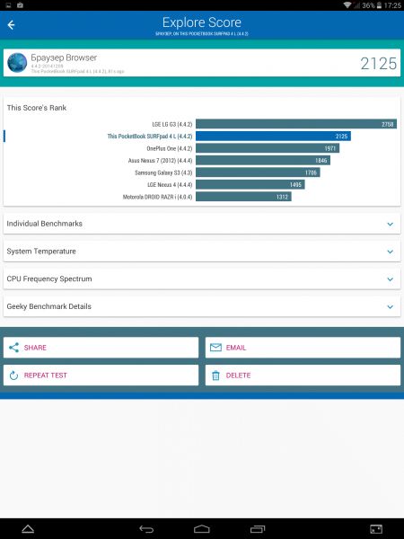 ПОРаботает планшет под управлением операционной системы Android 4.4.2 KitKat с пакетом предустановленных фирменных приложений PocketBook. При первом включении гаджета предлагается обширный список утилит, которые пользователь может при желании дополнительно установить в память SURFpad 4 L . Отмечу также наличие опции Clear Motion. Она активируется в меню настроек и придает плавности изображению в быстро меняющихся динамических сценах. Возле сенсорных кнопок навигации появился новый значок, позволяющий выводить приложения в качестве отдельного окна на рабочем столе. ВыводыPocketBook SURFpad 4 L - отличный вариант для комфортного серфинга в Сети, просмотра фильмов в высоком разрешении, чтения книг и игры во все доступные в Google Play Market игры. Да, планшет не из дешевых - $340, но, вместе с тем, фактически лишен крупных недостатков. Ну, разве что тяжеловат для ежедневной транспортировки и не обладает олеофобным покрытием экрана. Зато здесь отличный дисплей, высокопроизводительное «железо», качественные динамики, а также стильный корпус из металла и стекла.