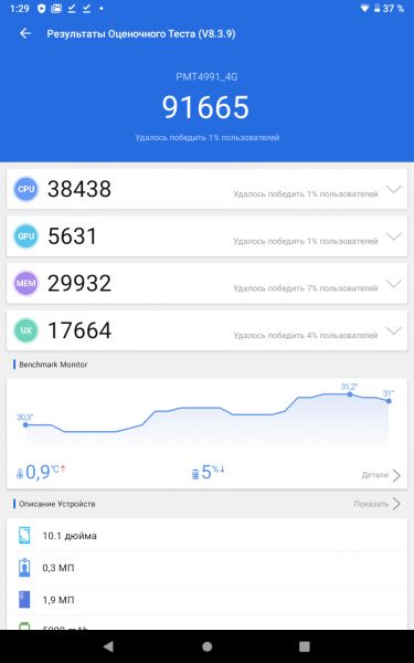 Тыльная панель, на которой помимо объектива камеры находится вспышка, информативна в плане подписей и правильно расположения лотков SIM карты и карты памяти, который находятся в торце под заглушкой. Тут же microUSB порт. Разъем под наушники обустроен сверху, по соседству с кнопками управления питанием и громкостью, а также микрофоном. Справа два динамика, внизу еще один микрофон. Динамики громкие и расстояние между ними достаточное, чтобы в играх не закрывать их рукой одновременно. Для справки, FM-радио присутствует, но для него нужна проводная гарнитура или наушники. Механические аппаратные клавиши на боках устройства имеют в меру мягкий ход и отчетливые нажатия. Они не крупные, но достаточно выпирают за пределы корпуса, чтобы легко находиться на ощупь. Важно отметить, что хорошо подогнаны и составные детали корпуса, так что сборка планшета претензий не вызывает. Итог по корпусу такой. Внешняя простота и хорошо подобранные материала корпуса лучшим образом отразилась на удобстве его использования. Дисплей IPS-дисплей GRACE 4991 4G получил диагональ 10.1 дюйм и разрешение 1280x800 точек. Не удивлюсь, если скажете, что мало. Действительно, некоторым будет не хватать FullHD, но даже при имеющихся параметрах пикселизация с расстояния 20-30 см мало заметна. Зато экономия на батарее. Дисплей большой, не придется напрягать глаза, когда смотрите фильмы, читаете новости или книги, играете. И делать это, замечу, могут сразу несколько человек – углы обзора достаточно широкие, без значительного сдвига цветов даже при больших отклонениях. Из коробки дисплей ничем не прикрыт, но производитель предусмотрел пленку в комплекте поставки. Олеофобное покрытие присутствует. Аппаратная начинка и производительность По меркам доступных устройств, к которым принадлежит GRACE 4991 4G, его внутренняя начинка выглядит достаточной для выполнения ежедневных задач. В паре с 8-ядерным процессором Spreadtrum SC9863A с частотой 1.6 ГГц работают графический чип PowerVR GE8322 и 2 ГБ оперативной памяти. Система не дала повода усомниться в ней, ни при воспроизведении видео, ни в графически сложных играх из разряда Need For Speed: No Limits, PUBG и конечно же в танковых боях. В качестве программной платформы производитель использует операционную систему Android 9 без добавления стороннего софта. Среди полезных функций отмечу: