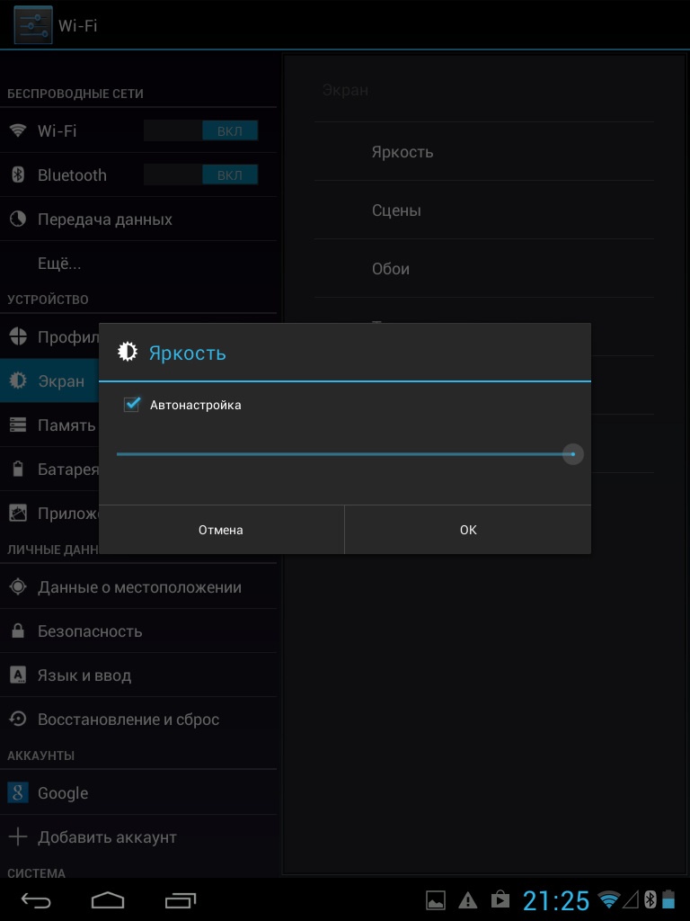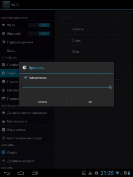 Яркость экрана регулируется как вручную, так и автоматически. Но даже ее максимального уровня показалось не совсем достаточно для комфортной работы с устройством в яркий солнечный день.