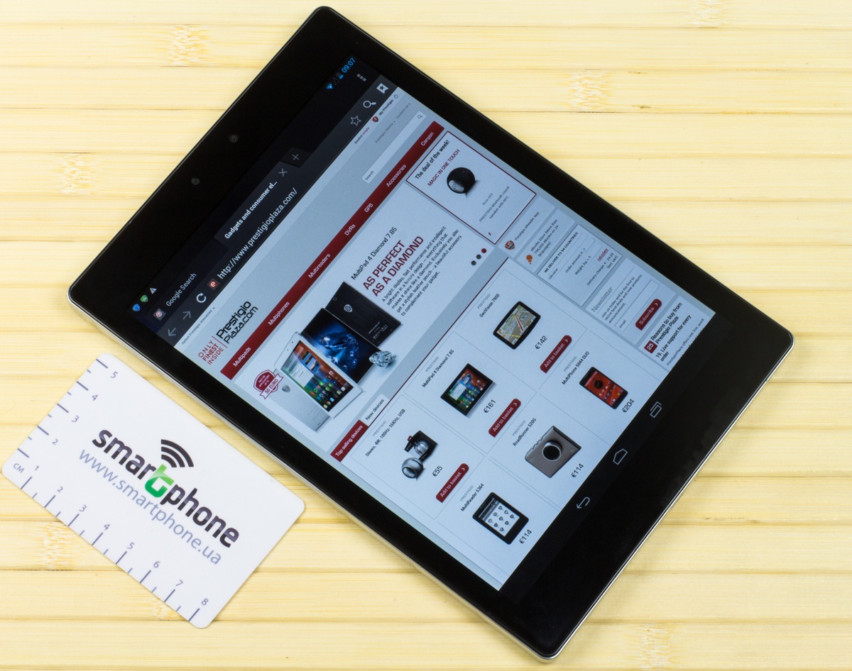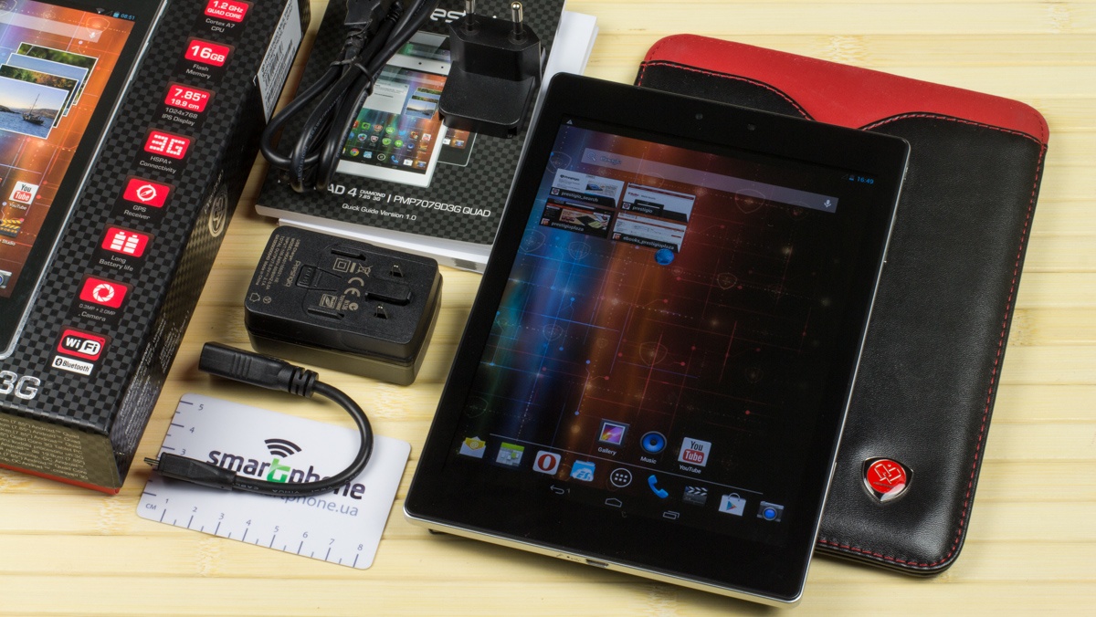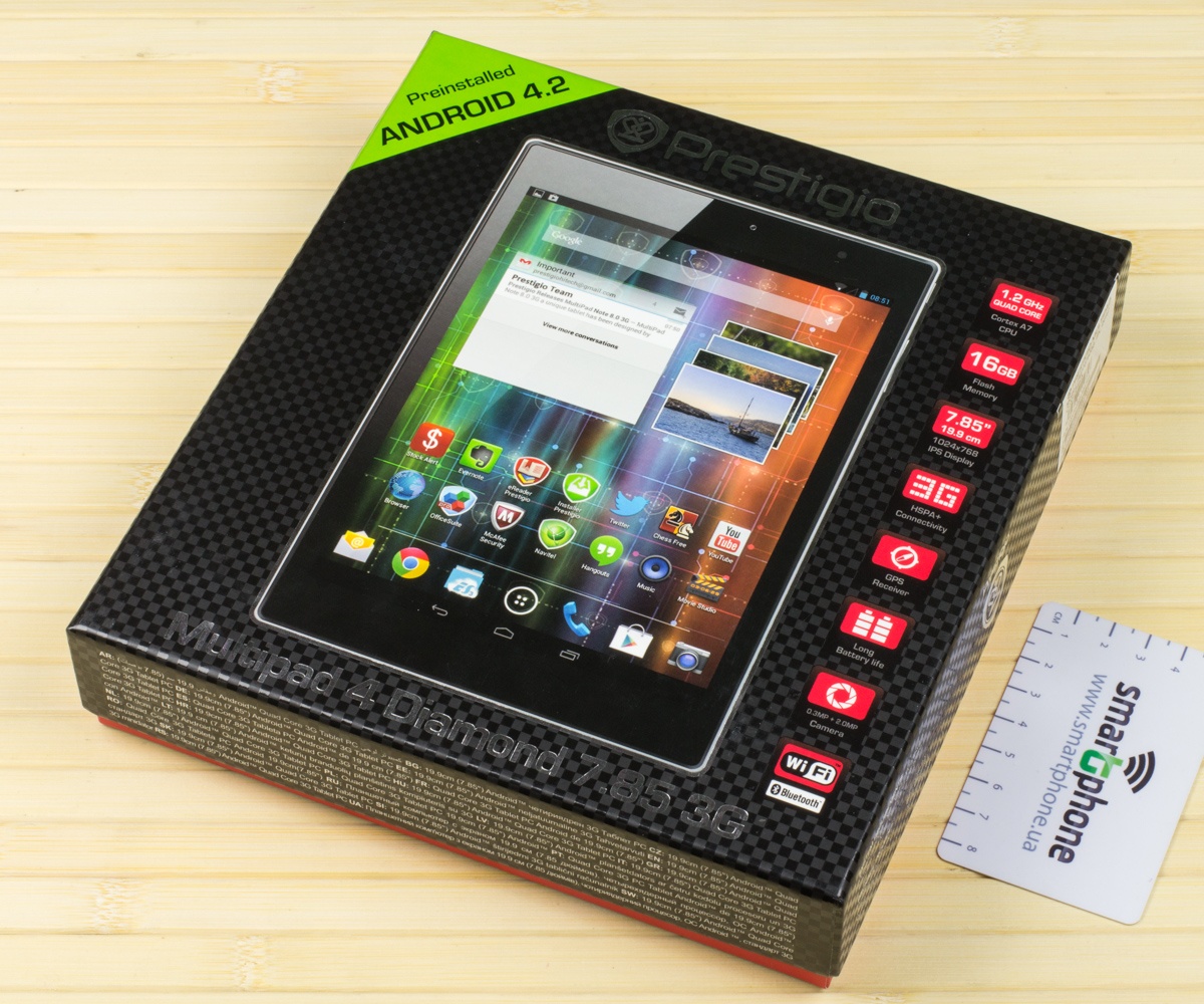 Обзор планшета Prestigio MultiPad 4 Diamond 7.85 3GДоступное решение с «ярким» дизайном, хорошим «железом» и возможностью звонить как с обычного мобильного телефона. Интересное предложение в формате устройства «на каждый день». Обо всех «за» и «против» новинки далее. Лень читать текстовый обзор? Смотрите видео-обзор...Упаковка и комплект поставкиВ прочной картонной коробке с узнаваемым дизайном пользователь найдет адаптер зарядного устройства со специальным переходником под наш класс розеток, кабель micro-USB/USB, необходимую документацию, чехол для транспортировки, а также USB OTG - переходник плюс специальную скрепку. Последняя здесь «открывает» доступ к лотку для SIM-карты. Материалы и сборка