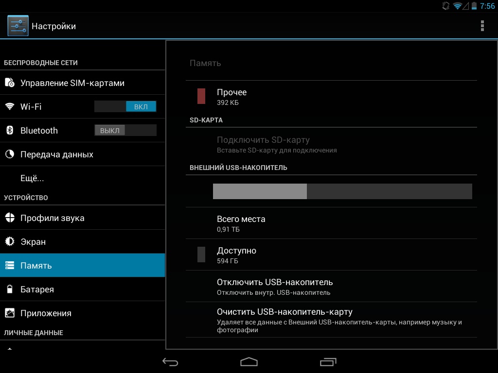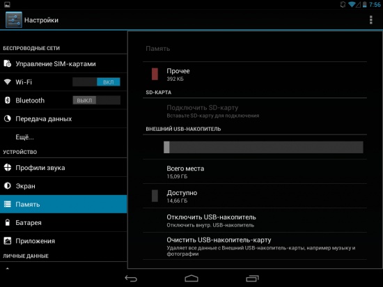 Расширение предусмотрено как при помощи карт памяти MicroSD до 32 ГБ включительно, так и посредством USB OTG подключения внешнего накопителя. В последнем случае у меня система распознала как 16 ГБ флешку, так и внешний диск на 1 ТБ.