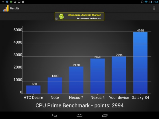 7,85-дюймовый дисплей создан на базе IPS-матрицы. Официально заявленное разрешение 768х1024 точки, хотя на практике оно немного меньше из-за строчки, на которой сосредоточены сенсорные кнопки - 768х976.