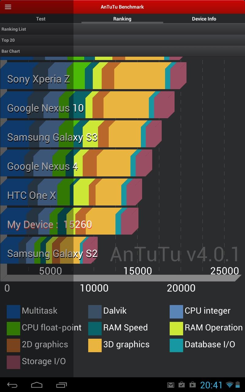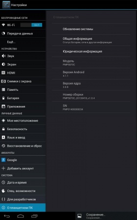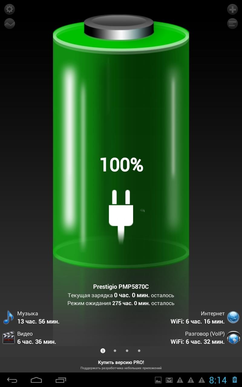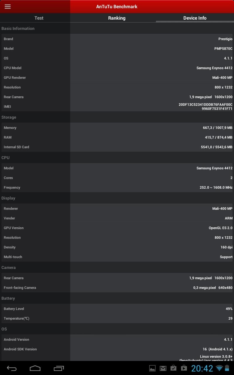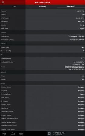 Габариты Вес Операционная система Аккумулятор 4000 мАч Аппаратная платформаВ основе Prestigio MultiPad 7.0 Ultra Duo 2-ядерный чип, тактовая частота которого 1.6 ГГц, и графический ускоритель Mali 400 MP. Объем оперативной памяти 1 ГБ. Кроме того, заявлено о 8 ГБ встроенной пользовательской, однако работать получится только с 5,4 ГБ. Те, кому данного доступного объема покажется мало, могут расширить его с помощью карт памяти формата MicroSD до 32 ГБ включительно. Работает девайс «из коробки» под управлением Android 4.1.1 Jelly Bean. Производительности «железа» оказалось вполне достаточно для обеспечения стабильной работы системы и быстрой загрузки даже ресурсоемких приложений.Кроме того, на Prestigio MultiPad 7.0 Ultra Duo можно смотреть Full HD-видео и играть в довольно требовательные игры, за исключением «тяжёлых» 3D игрушек. В тестах девайс показал неплохие для своей ценовой категории результаты, можете убедиться в этом наглядно. КоммуникацииНабор коммуникаций включает в себя модуль Wi-Fi 802.11b/g/n для выхода в Сеть, выход mini-HDMI для вывода фото- и видеоконтента с планшета на большой экран телевизора. В наличии также USB-OTG-переходник, позволяющий подключать к девайсу мышку, клавиатуру, USB-флешку, внешний HHD, а также USB 3G-модем. АккумуляторЕмкость аккумулятора 4000 мАч. Возможности автономной работы устройства в различных режимах использования уже традиционно проверила с помощью тестера «Батарея HD». ДинамикиДинамиков у MultiPad 7.0 Ultra Duo два. Они имеют хороший запас громкости и вполне неплохую детализацию звука. Даже на максимуме воспроизводимый ими звук оставался чистым и без искажений. Что хотелось бы особо отметить, так это удачную конструкцию динамиков.Благодаря ей, даже в случае горизонтального удерживания планшета, когда они прикрываются рукой, уровень звука не падает. КамераВ планшете установлены две камеры — VGA фронтальная и основная на 2Мп. Перовой мне показалось вполне достаточно для общения onlineпри достаточном освещении, а вот от основной добиться фото в более-менее приемлемом качестве мне так и не удалось, даже несмотря на наличие предустановленных режимов съемки. Впрочем, если под рукой нет смартфона, то в случае особой необходимости можно запечатлеть важный момент и на камеру MultiPad 7.0 Ultra Duo. Программная платформаВ MultiPad 7.0 Ultra Duo используется традиционный для устройств данного производителя набор фирменных приложений, среди которых Prestigio eReader, установщик Prestigio Installer и OTA Update. Первое открывает доступ к магазину книг, второе предлагает установку приложений сторонних производителей, а третье отвечает за получение обновлений. ВыводыПодводя итог,могу сказать, что Prestigio MultiPad 7.0 Ultra Duo - стильный и достаточно мощный для своей ценовой категории планшет в металлическом корпусе. Он к тому же может похвастаться неплохим IPS дисплеем с большими углами обзора и чувствительным сенсором, хорошими динамиками, возможностью подключения внешних устройств, включая 3G-модемы, а также воспроизведением Full HD видео и большинства ресурсоемких игр. С оглядкой на демократичный ценник вполне можно простить производителю недостаток в виде не самой лучшей основной камеры, установленной в данное устройство. Плюсы- Металлический корпус;- Хорошие возможности встроенного динамика; - Android 4.1.1 «из коробки»; - Добротное оснащение и производительность; - Возможность подключения внешних устройств Минусы- Не лучшее повед