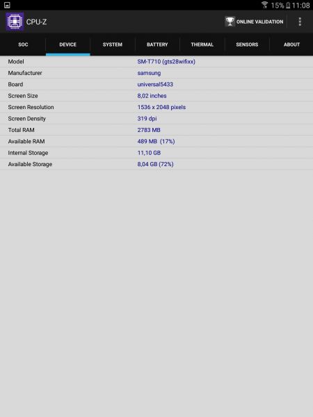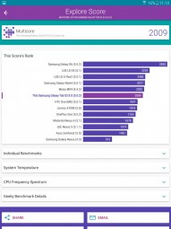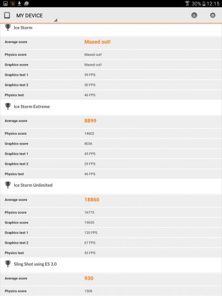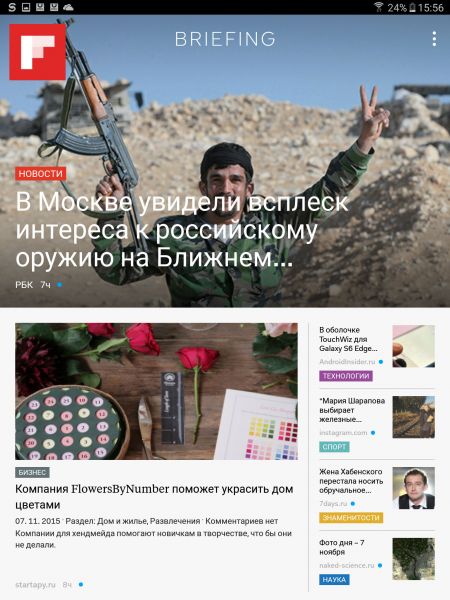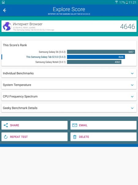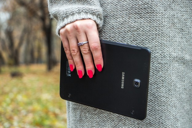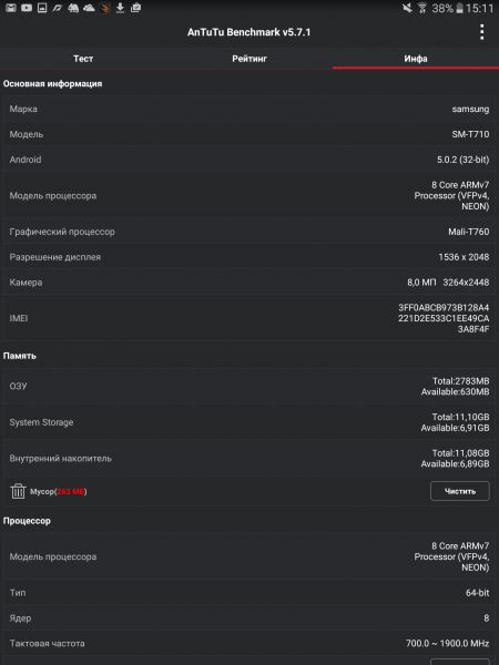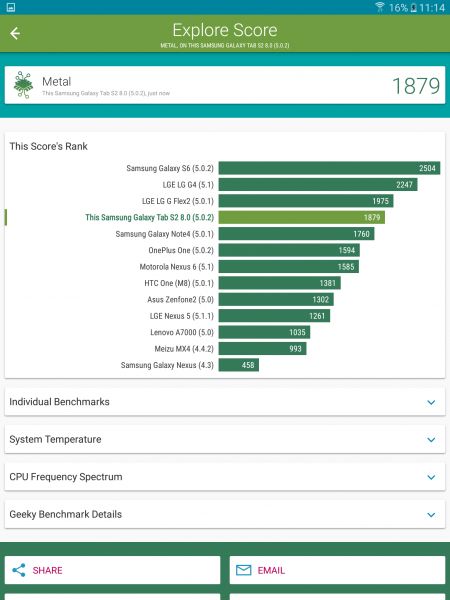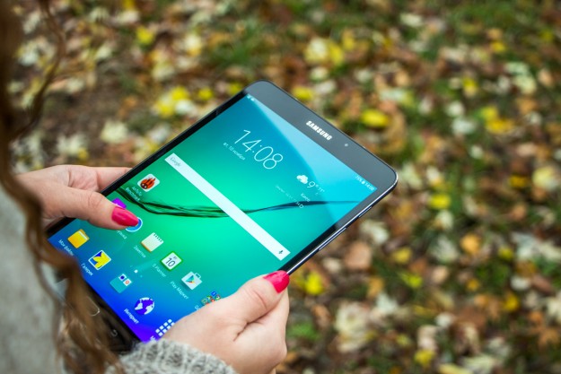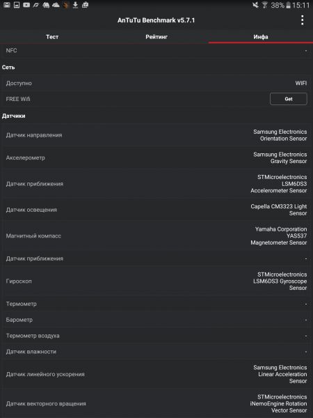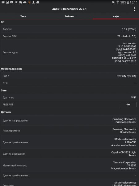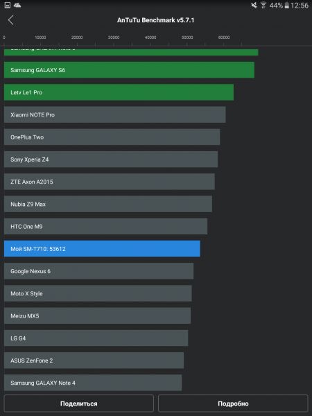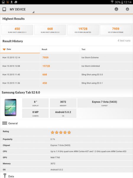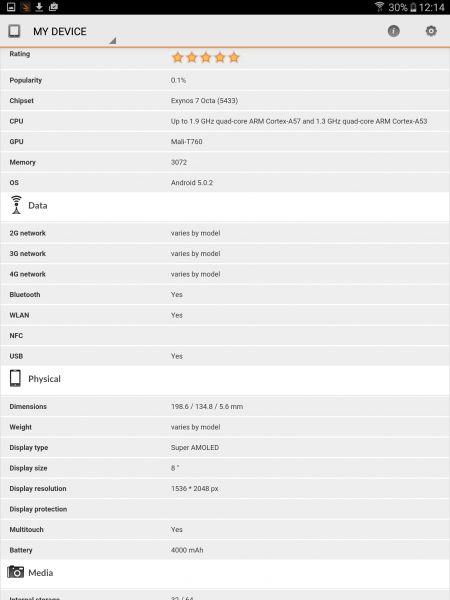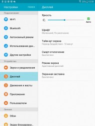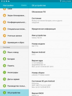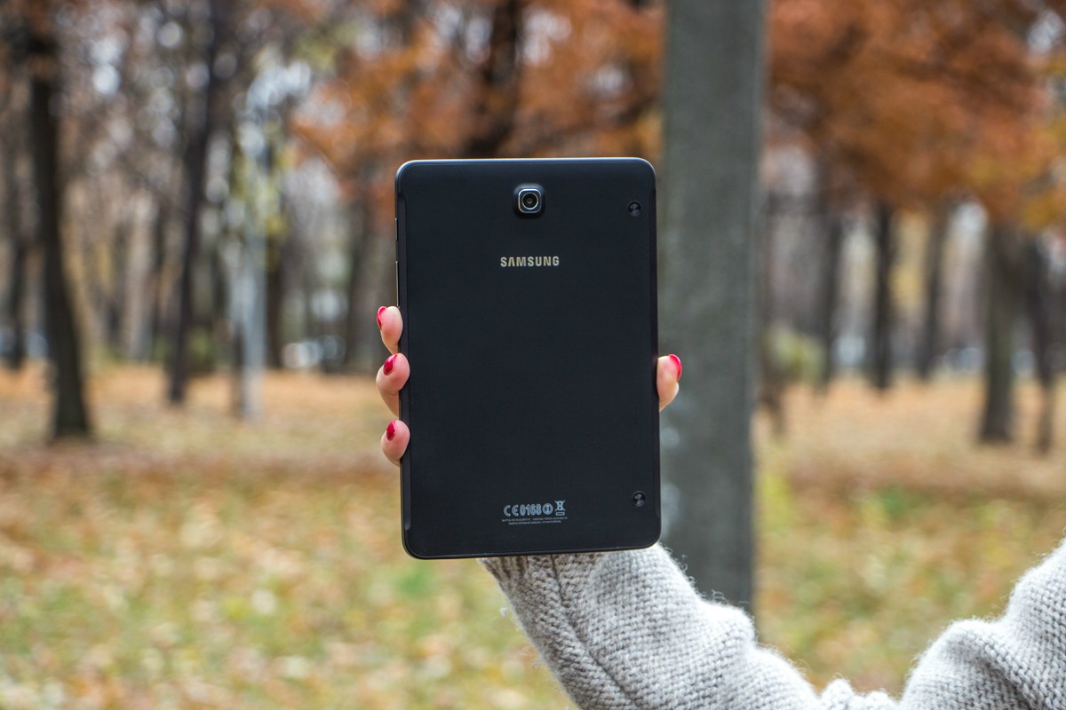 Обзор планшета Samsung Galaxy Tab S2 8.0 (SM-T710) – тоньше не бывает!Новый мировой рекордсменом по толщине от корейского технологического гиганта— всего 5.6 мм — абсолютный рекорд на сегодняшний день в классе 8-дюймовых планшетов. Впрочем, приятно удивить Galaxy Tab S2 8.0 может не только изящным дизайном, но и мощным «железом» и множеством других полезных мелочей, о которых мы и расскажем далее в обзоре. Лень читать текстовый обзор? Смотрите видео-обзор...Дизайн и функциональные элементы Компания Samsung как всегда впереди планеты всей. Вот и самый тонкий в мире 8-дюймовый планшет рук дело их инженеров. Сказать по правде, когда берешь Galaxy Tab S2 8.0 в руки, сложно даже поверить, что у этого «тощего корейца» внутри может быть куча всяких модулей, мощное железо плюс еще и батарея. Однако поверьте, все на месте. А за счет компактных габаритов — 198.6x134.8x5.6 мм при весе 265 г, этот планшет, как никакой другой, с легкостью помещается в карман пиджака и любую женскую сумочку, не отягощая ее при этом. Держать его удобно даже одной рукой, что, кстати, весьма актуально для версии с поддержкой сотовой связи. Да, даже несмотря на рекордно тонкий корпус планшета, на его гранях поместились все необходимые разъемы и кнопки. Справа — клавиша питания, качелька регулировки громкости и слот для карт памяти microSD. Сверху находится микрофон шумоподавления, а снизу порт microUSB, 3.5 мм аудиовыход и пара мультимедийных динамиков. На передней панели устройства над 8-дюймовым экраном расположились датчик освещения и 2.1 Мп фронтальная камера. Под дисплеем традиционно для флагманских устройств Samsung находятся две сенсорные кнопки управления с подсветкой, а также физическая клавиша «Home» со встроенным биометрическим сенсором. Переходя к тыльной панели планшета, нельзя не отметить наличие двух кнопок для установки фирменного чехла, а также слегка выступающий над поверхностью объектив 8Мп камеры. Качество сборки, как и подобает продукту Samsung, на высоте — ни единого скрипа, никаких щелей. Плюс ко всему Galaxy Tab S2 8.0 крайне приятен тактильно за счет софт-тач покрытия его тыльной панели, изготовленной из пластика. Ободок по периметру корпуса металлический с полированной гранью. На первый взгляд используемые материалы выглядят очень качественными, однако то, насколько они износостойкие — покажет только время. На мой же взгляд, чехол будет этому планшету не лишним. ДисплейПомимо «изящного» дизайна в Galaxy Tab S2 8.0 отдельного внимания заслуживает дисплей. Он выполнен по технологии Super AMOLED и имеет разрешение 2048x1536 точек при диагонали 8 дюймов. Плотность пикселей на дюйм — 320 ppi. К четкости изображения претензий нет — мелкие шрифты радуют глаз отсутствием «рыхлости». Кроме того, дисплей располагает широкими углами обзора, отменной цветопередачей, высокой контрастностью и яркостью. Так что даже на солнце остается прекрасно читаемым. К тому же датчик освещенности в автоматическом режиме отлично подстраивает яркость под любое освещение. А в подменю «Режим экрана» можно настроить дисплей специально под выбранный тип задач, к примеру, чтение. Экран планшета, хотя и не реагирует на прикосновения пальцев в печатках, имеет очень чувствительный сенсор, распознающий до 10 даже самых легких касаний. За счет качественного олеофобного покрытия, нанесенного поверх защитного стекла, палец легко скользит по панели, а отпечатк