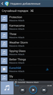 В меню проигрывателя композиции сортируются по песням, альбомам, исполнителям и пр. Во время воспроизведения на экране отображается обложка альбома, а если в памяти ее нет, то просто картинка с нотой. Над этой картинкой находится сенсорная кнопка регулировки громкости звука, здесь же отображается название проигрываемого трека и пр. В самом низу имеется строчка воспроизведения.