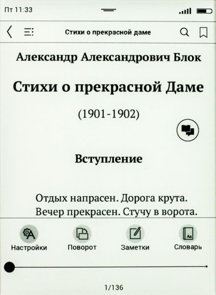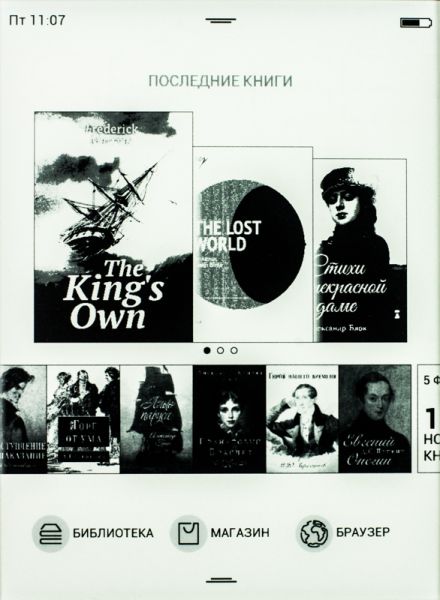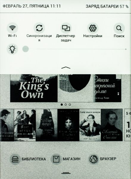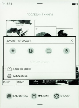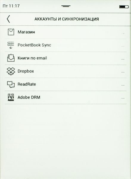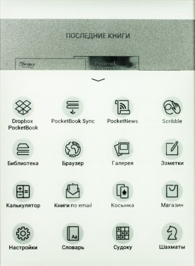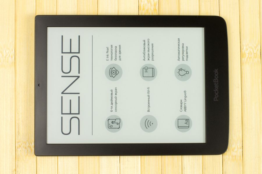 Под кнопки управления и разъемы в ридере отдана нижняя грань. Здесь находится разъем microUSB, клавиша питания и открытый слот для microSD-карт. К качеству сборки корпуса не придраться - проработка качественная, никаких скрипов и зазоров не наблюдается. Экран6-дюймовый дисплей ридера выполнен по технологии E Ink Pearl и имеет разрешение 1024x758 точек, что соответствует плотности пикселей 212. Шрифт выглядит гладким и четким. Если в опциях ридера установить функцию «Обновлять экран всегда», то в итоге получаем очень чистое и качественное изображение, без очертаний строк предыдущих страниц. Экран снабжен технологией мультитач, которая позволяет масштабировать изображения и текст как в браузере, так и в режиме чтения. Отзывчивость сенсора отличная– с его помощью можно быстро выбирать пункты меню, листать страницы, осуществлять навигацию. Подсветка экрана равномерная, даже трудно сразу определить, где расположены светодиоды. Как уже упоминалось ранее, используется автоматическая регулировка яркости. Оснащение и производительностьПо аналогии с Ultra, аппаратная начинка Sense представлена процессором с тактовой частотой 1 ГГц, 512 МБ оперативной памяти и 4 ГБ встроенной. Расширить объем последней можно microSD-картами до 32 ГБ. Кроме того, еще одним способом хранения информации может стать облачное хранилище Dropbox. Этого хватит с головой для приличной библиотеки, состоящей из нескольких тысяч книг. К тому же в отличие от Ultra здесь нет поддержки MP3 файлов, которые бы активно пожирали память. В целом производительностью ридера остались довольны - реализованное оснащение обеспечивает «шуструю» работу интерфейса и в частности быстрое перелистывание страниц. Не возникло проблем и с открытием книг в заявленных производителем форматах. Из покетбуковских «фишек» традиционно поддержка большого количества текстовых форматов: PDF, PDF (DRM), EPUB, EPUB(DRM), DJVU, FB2, FB2.ZIP, DOC, DOCX, RTF, PRC, TCR, TXT, CHM, HTM, HTML, MOBI, ACSM плюс четырех форматов изображений: Jpeg, BMP, PNG, TIFF. Получил Sense и Wi-Fi-модуль, на котором, по сути, завязаны все предусмотренные здесь фирменные сервисы производителя: RSS-агрегатор новостной ленты PocketNews, магазин Obreey Store, ReadRate, позволяеющий делиться понравившимися цитатами, любимыми книгами, своими впечатлениями от прочитанного в соцсетях, PocketBook Synс, автоматически синхронизирующая читалку с аккаунтом в магазине Obreey Store, а также сервис «Книги по e-mail» с возможностью отправки книг на аккаунт, привязанный к устройству. АвтономностьАккумулятора ридера емкостью 1500 мАч, по словам производителя, должно хватить на 8тысяч страниц без подсветки. На максимальном же ее уровне, а также с активным Wi-Fi-соединением, эта цифра на практике уменьшается как минимум вдвое. ИнтерфейсПрограммное обеспечение Sense, как и модели Ultra, базируется на операционной системе Linux с пользовательским интерфейсом, который, на мой взгляд, будет понятен даже тем, кто впервые берет в руки ридер от PocketBook. Главное его меню включает в себя последние добавленные/прочитанные книги и иконки разделов «Библиотека», «Магазин» и «Браузер». Свайпом от верхней и нижней кромок можно вытянуть шторки, скрывающие дополнительные элементы управления: диспетчер задач, настройки Wi-Fi–соединения, регулировка яркости подсветки, функция поиска, ручной запуск синхронизации с сервисами и раздел «Настройки», а также широкий набор функций и програм