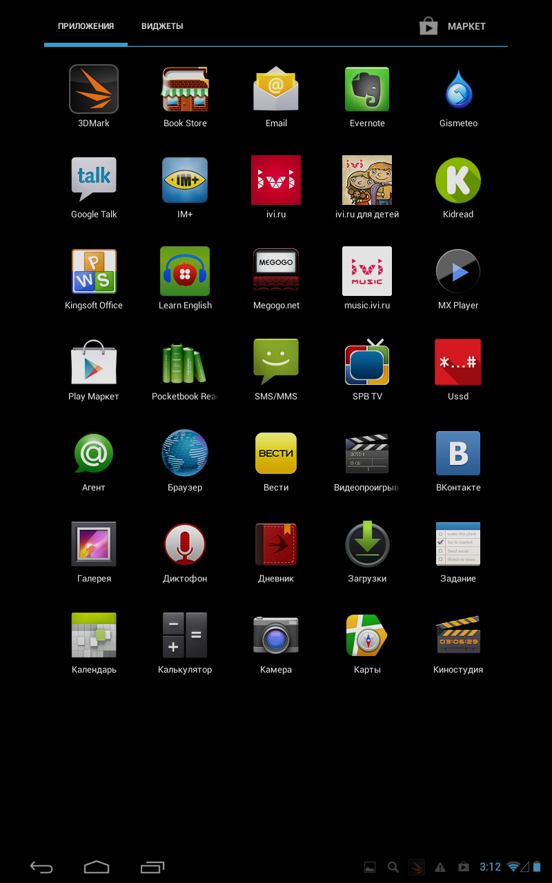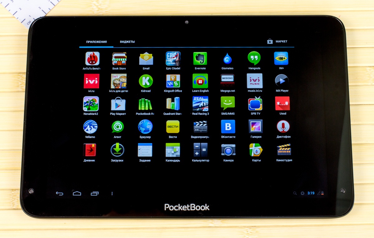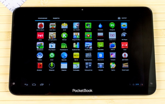 При первом включении устройство предлагает пользователю сразу же установить достаточно широкий набор софта на личное усмотрение: приложения онлайн-кинотеатров Megogo и ivi.ru, сервисы Яндекс. Карты, Яндекс. Навигатор, Яндекс. Погода, Mobile. Yandex и Yandex.Store, приложения социальных сетей ВКонтакте и Одноклассники, утилиту SPB TV, позволяющую смотреть мобильное ТВ онлайн, программы PocketBook Reader, Kidread, Book Store, а также офисный пакет Kingsoft Office и многие другие.