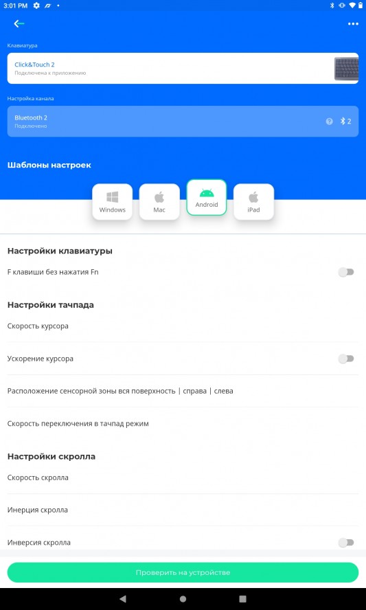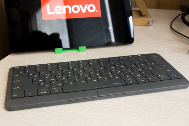 Если неделю попользуетесь и привыкните к этой клавиатуре, потом захотите такого же от своей клавиатуры в ноутбуке или компьютере. Реакция клавиатуры на действия пользователя моментальная. Набор текста Основная задача клавиатуры – набор текстовой и цифровой информации. Этот процесс должен быть комфортным и удобных, а иначе зачем покупать для этого отдельный аксессуар, на смартфонах и планшетах можно пользоваться стандартной на экранной клавиатурой. Клавиши с ножничным переключателем имеют ход около 1-1,5 мм и удобны своим немаленьким размером даже для набора текста в слепую. Между клавишами почти нет места, они должны касаться друг друга, чтобы поверхность была более гладкой / плоской при работе тачпада. Для тех же, кто привык печатать на больших клавиатурах, придется немного подстраиваться. Пару часов и готово! Автономность В Prestigio Click&Touch 2 встроен аккумулятор емкостью 1800 мАч, которого хватает на 14-16 часов работы. Если на время не работаете с устройством, оно переходит в режим ожидания и потребление энергии снижается. Полная зарядка занимает до 2 часов. Варианты использования С мышкой все-таки удобней! Особенно для работы и обработки контента. А вот позицию мобильной клавиатурой для поездок, подключения к смарт-ТВ или ТВ-приставке, игровой приставке, для работы на планшете или смартфоне вдали от основного рабочего места – идеальный вариант. Выводы Prestigio Click&Touch 2 – универсальная и многофункциональная клавиатура. Это не классический аксессуар для набора текста на ПК, хотя и эту функцию она обеспечивает на 100%. Помимо персонального компьютера, устройство дополнительно позволяет подключиться к трем мобильным гаджетам, быстро переключаться между ними, а также использоваться поверхность клавиш в качестве тачпада.