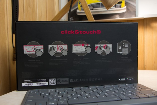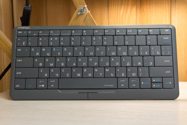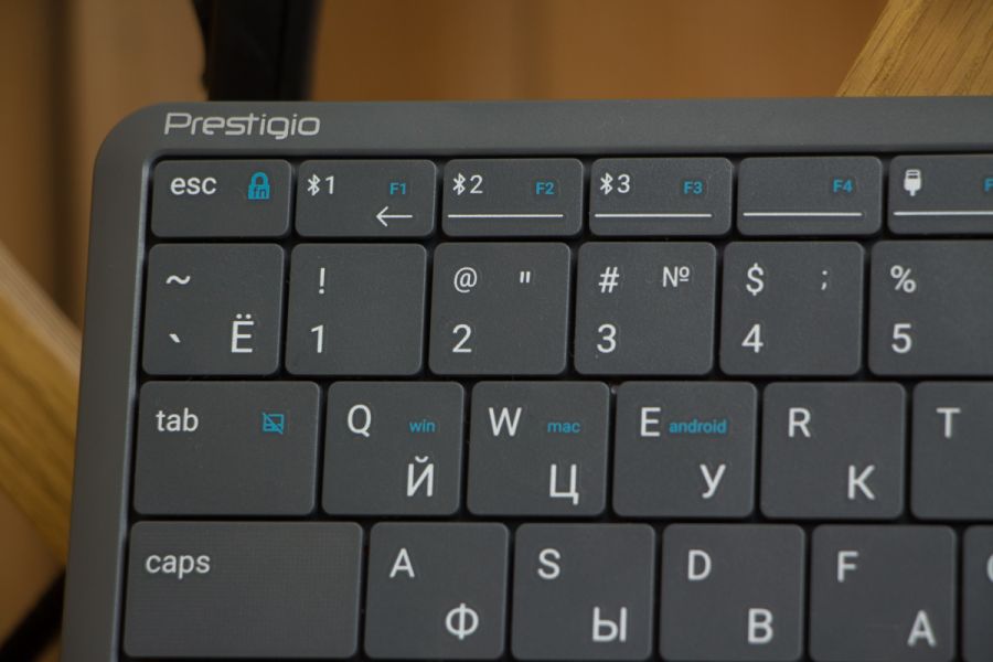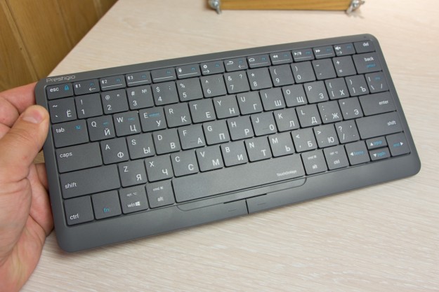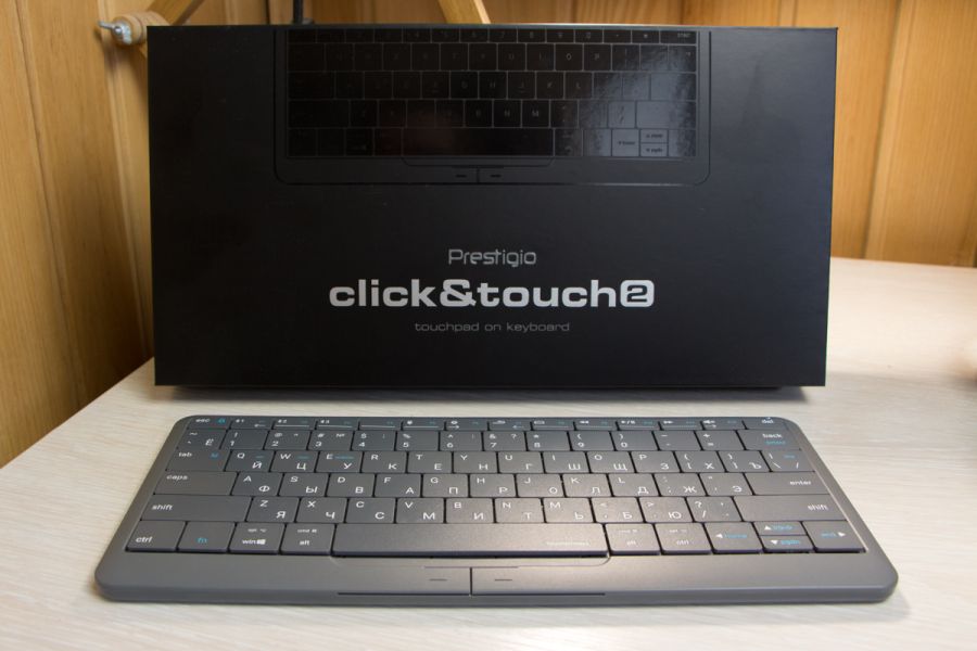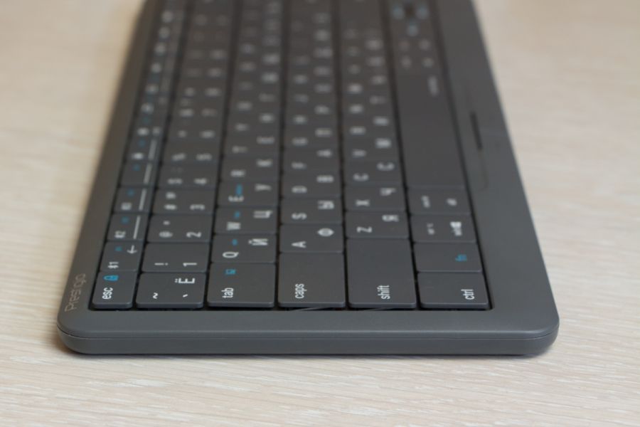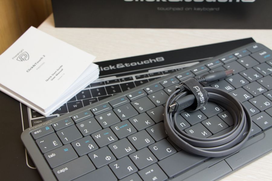 Обзор Prestigio Click&Touch 2: беспроводная клавиатура + тачпадКак сделать клавиатуру не очень скучной? Учитесь у Prestigio! На рынок выходит уже вторая их беспроводная клавиатура, кнопки которой выполняют функцию тачпада. Нажимаете на цифры и буквы – набирается текст, проводите пальцем и легонько прикасаетесь – повторяются функции мышки. Подробности в обзоре. Дизайн и Корпус Prestigio Click&Touch 2 – легкий аксессуар весом 283 г, которому не нужен провод для подключения к другим устройствам. Габариты 280 х 128 х 11,7 мм. Корпус пластиковый, серого цвета с большими клавишами и нанесенной на них маркировкой белого цвета. Дополнительные функции кнопок уточнили наклейками синего цвета. Раскладка – ничего необычного или того, к чему придется долго привыкать. Единственное – правая и левая кнопка мышки под пробелом. Количество кнопок – 78. Над клавиатурным блоком слева – название бренда, а справа – индикатор. По нему можно понять остаток заряда и режим, в котором сейчас находится устройство. Клавиатура заряжается через USB Type-C порт, место для его подключения выбрали справа на верхнем торце. Рядом с ним переключатель вкл./выкл. Внизу шесть прорезиненных ножек, которые на 0,5 мм поднимают корпус над поверхностью. Они придают устойчивости. По сборке без замечаний. Возможности Обозреваемая клавиатура не ограничивается подключением только к одному устройству. Покупатель сможет соединить ее сразу с тремя гаджетами по Bluetooth и одним по USB Type-C (кабель в комплекте длиной 1,5 м). Например, с планшетом, смартфоном и ПК. Чтобы переключиться зажимаем кнопку на цифровом блоке – 1, 2 или 3. Prestigio Click&Touch 2 реализует видимое и тактильное волшебство благодаря микродатчикам под каждой копкой, которая входит в область тачпада (80% площади). Переход между режимами работы проходит незаметно для пользователя. Более точно подстроить под себя устройство можно через приложение Clevetura App.