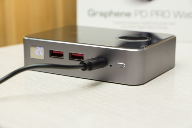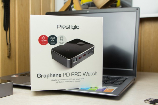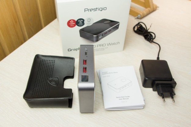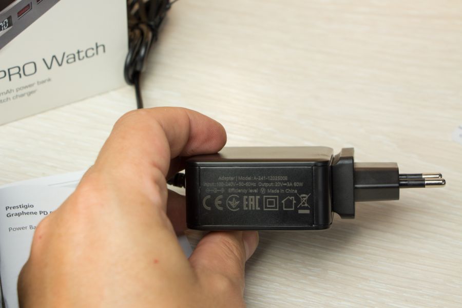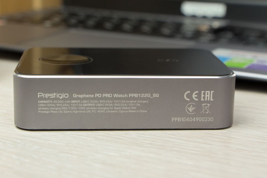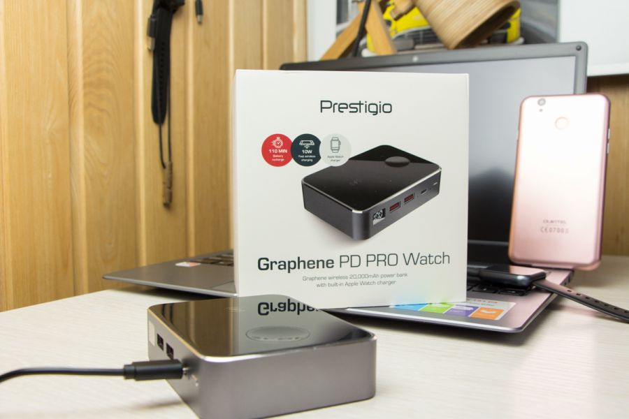 Обзор Prestigio Graphene PD PRO Watch Edition – графеновый павербанк для проводной и беспроводной зарядкиГрафен – красивое слово, но еще и перспективный материал для совершенствования технологий в портативных аккумуляторах - павербанках. Prestigio решили не останавливается на имеющихся на рынке наработках и двигаться на перспективу. Результат уже есть в виде Prestigio Graphene PD PRO Watch Edition. Подробности об устройстве далее в обзоре. Prestigio не скромничает и на сайте указывает, что обозреваемый гаджет - полноценный графеновый аккумулятор. Плюсы и минусы Li-Ion (литий-ионных) или Li-Po (литий-полимерных) батарей – отдельная тема для большого изучения. Графен – вот центральная технологическая изюминка тестируемого устройства. Материал обладает отличной электро- и теплопроводностью, легкий, тонкий, да еще и прочнее стали. Немного цифр. А значит на его основе можно делать аккумуляторы большей емкость, которые будут меньше по габаритам и легче. А еще такая батарея будет заряжаться быстро и без существенного нагрева. Одна загвоздка – дорого. Но Prestigio Graphene PD PRO Watch Edition все же не стоит всех денег мира, а набор его функций боле чем достаточный. Подробности далее. Комплектация Коробка с павербанком белая, тяжелая, выглядит дорого. Внутри павербанк, провод USB Type-C – Type A, черный кожаный футляр, адаптер питания на 60 Вт с насадками в виде универсальной вилки для европейских розеток и еще одной под США. Чехол – полезное дополнение, если планируете носить устройство с собой. Дизайн и Корпус Prestigio Graphene PD Pro – выглядит дорого и красиво, на всю свою стоимость. Дизайн проработали со всех сторон, использовали только дорогие металл и стекло. Серый алюминий удачно сочетается с черным стеклом. Полированная кромка усиливает положительное визуальное восприятие. Маркость глянцевых поверхностей присутствует, но вытираются они легко. По логотипу беспроводной зарядки и выемке под часы определяем, где верх, а где них. Мощность - 10 Вт. Внизу логотип Prestigio. На тыльной стороне для справки напомнили основные характеристики портов. На лицевой стороне: