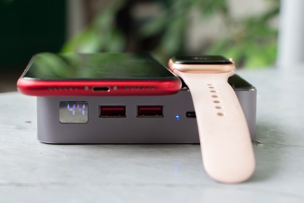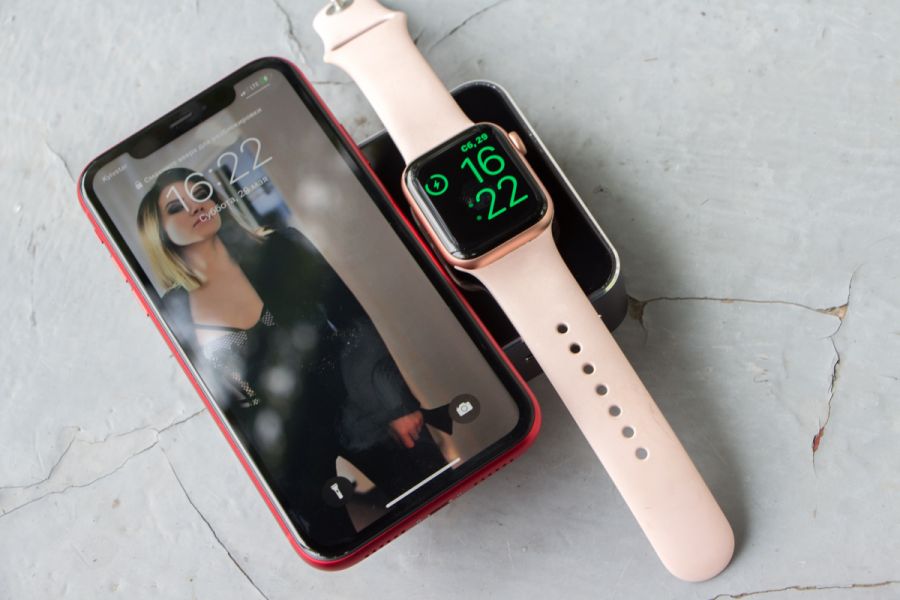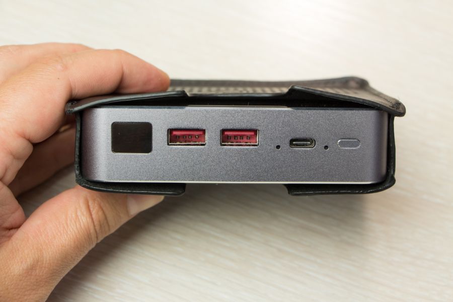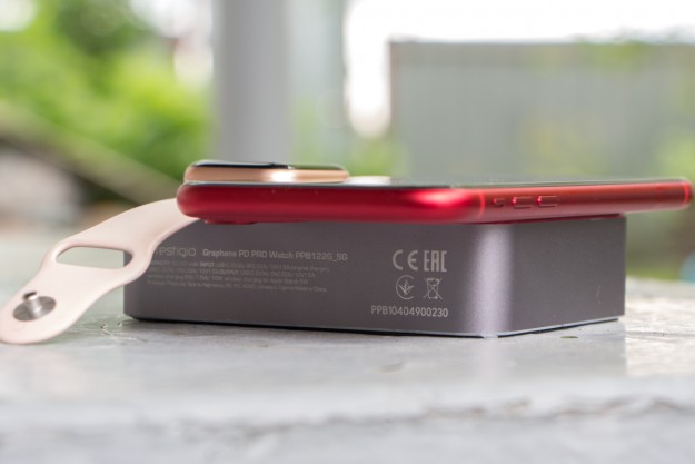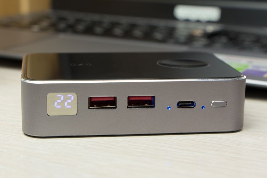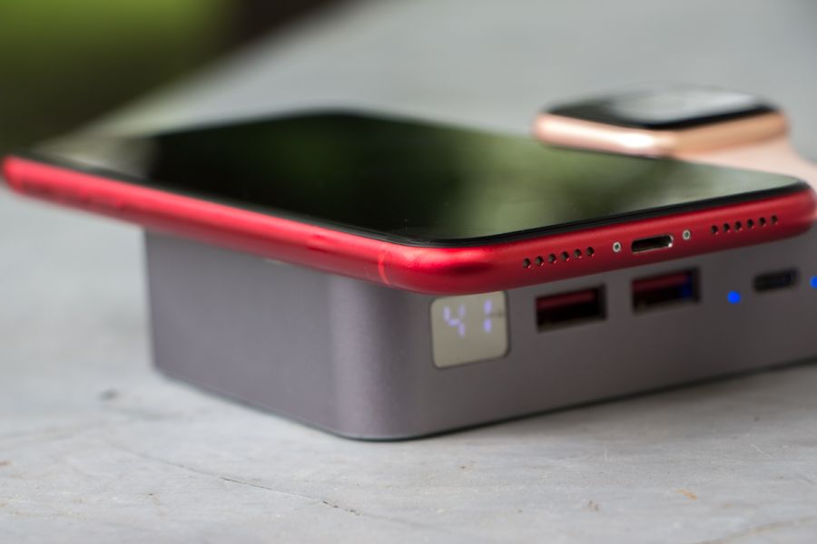 Габариты 81,9х26,5х110,3 мм. Вес – 490 г. Возможности Емкость павербанка Prestigio - 20 000 мАч, или в ватт-часах – 74 Вт*ч. Использование в реальных условиях показало, 100% заряда батареи хватает на 5-6 зарядок iPhone 11 или 1 раз зарядить MacBook Air 2020 года. Чтобы начать процесс зарядки нужно или положить смартфон на площадку сверху, или подключить провод и нажать на кнопку питания. Подключаете втрое устройство – еще раз нажимаете кнопку. Для беспроводной зарядки даже не самый тонкий чехол на смартфоне – не проблема. Комплектный чехол на батарее также не нужно снимать при беспроводном контакте. Одновременно от Prestigio Graphene PD PRO Watch Edition можно заряжать 5 устройств: