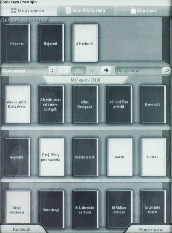 Раздел «Библиотека» открывает доступ к фирменному книжному онлайн-магазину Prestigio, где можно скачать тысячи книг как платно, так и бесплатно, собранию литературы на разных языках, предустановленной самим производителем, а также  библиотечному фонду, загруженному  уже пользователем. Всю литературу на «Полке» можно отсортировать по четырем категориям: название, автор, избранное  и недавно добавленное, а в подразделе «Моя библиотека» их можно еще и добавлять в коллекции, делить на категории.
