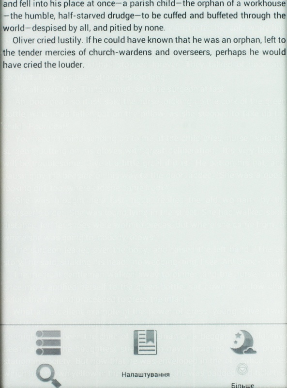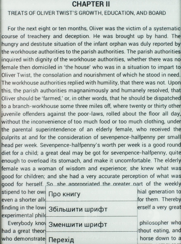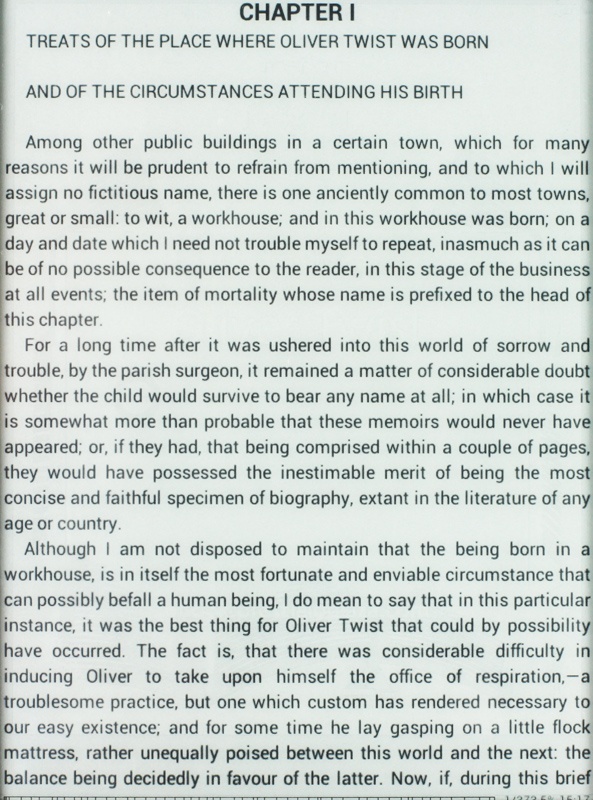 Предусмотрен также и скроллинг. Отзывчивость сенсорного экрана я бы в целом оценила как среднюю. Отмечу также, что даже после полного обновления каждой страницы остаются заметными остатки строчек предыдущей, хотя сказать, что это уж очень отвлекает от самого процесса чтения, я не могу.