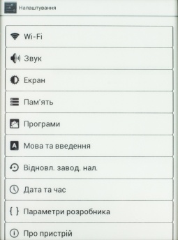 В «Настройках» можно включить/выключить Wi-Fi-соединение, выставить уровень громкости динамика, установить дату и время, выбрать язык интерфейса, узнать информацию об устройстве, задать время автовыключения девайса, а также настроить обновление страницы.