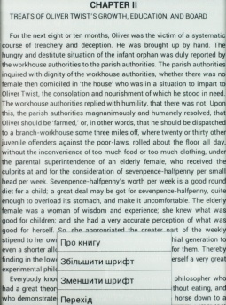 В режиме чтения пользователю открывается доступ  к таким функциям, как автоматическое перелистывание, вращение изображения на экране, переход к определенной странице,  изменение размера и стиля шрифта, межстрочного расстояния. Здесь же можно открыть содержание, добавить страницу в закладки или открыть сохраненные.