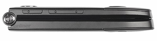 Что касается боковых кнопок, то их можно нажимать как ногтем, так и подушечкой пальца. Они не подписаны, поэтому их расположение придется запомнить: камера запускается кнопкой с правого торца, громкость регулируется спаренной клавишей с левого, там же находится и клавиша голосового набора. Чуть выше, на шарнире, размещен крючок для крепления ремешка. При весе устройства менее 100 грамм его наличие более чем оправдано.
