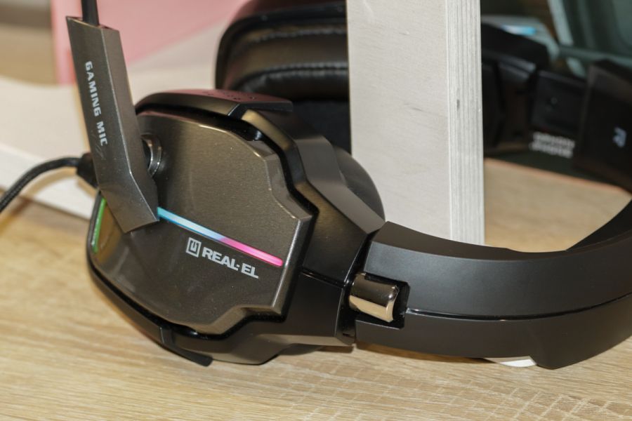 Материалы и качество сборки В корпусе REAL-EL GDX-7680 производитель не поскупился на глянец, который отлично скомпоновал с матовой дужкой и такой же окантовкой ушных чашек. В результате получилось не просто красиво, получилось дорого. С ходу вы вряд ли скажете, что цена девайса менее $30 – выглядит явно дороже. Дужку усилили металлической пластиной, сделав ее умеренно-жесткой! Что это значит? Ну скажем так, при жарких баталиях с головы не слетит, но и ощущения, что у тебя на голове тиски не будет. Амбушюры из мягкой дышащей эко-кожи. То же самое касается оплетки поролона на внутренней стороне дужки. Оплетка кабеля - ткань. Материалы корпуса микрофона – пластик и гибкий полимер. Кстати, благодаря последнему вы можете максимально удобно подстроить расположение микрофона под себя. Впечатления от эргономики Здесь все предельно просто. Управление звуком, микрофоном и, собственно, подсветкой производитель вынес на небольшой пульт. Легко заметить – пульт встроен на кабеле. Единственное, что здесь еще отметим – подсветка на микрофоне отключается с выключением его самого и никак иначе. На наш взгляд – это хороший формат, чтобы понимать, что микрофон отключен. В расположении микрофона на корпусе гарнитуры легко разобраться уже по фото к этому обзору. Он сделан на специальном шарнире, а потому является поворотным. Работа выполнена добротно – не подкопаешься. Кабель и подсветка У REAL-EL GDX-7680 длинный 2,2-метровый кабель, чего достаточно для подключения совершенно любого плана, даже если ваш системный блок расположен под столом в дальнем углу. К слову, для подключения к ПК в комплекте поставки предусмотрен специальный переходник, позволяющий выполнить полноценное подключение. Штекер USB здесь – это подсветка. Последняя работает как от USB-порта ПК, так и при подключении к повербанку. У кабеля тканевая оплетка. Ее качество нам понравилась – в процессе эксплуатации она не кашлатится. Сам же кабель не спутывается. Предохранители от перегибов на стыках предусмотрены. Одной из кнопок на отмеченном выше пульте является кнопка работы с подсветкой. На ней сноска LED, а потому не перепутать. Реализованная подсветка здесь в нескольких сценариях, переключение между которыми выполняется при помощи этой же кнопки. Последняя же выключает подсветку полностью, правда только на наушниках, для отключения микрофона уготована отдельная клавиша на этом же пульте. По части подсветки производителю стоит отдать должное – реализация действительно интересная. Многоцветный формат плюс несколько сценариев способны настроить на игру – это куда интереснее, чем один цвет и один сценарий, который очень часто можно встретить в данной ценовой категории и даже несколько выше нее. Впечатления от посадки на голове У REAL-EL GDX-7680 надежная автоматическая регулировка оголовья. Да, к особенностям ее хода некоторое время нужно привыкать, но длительной эта процедура не будет – мы проверили. Саму же посадку можно оценить как отличную – нет того противного ощущения сдавливания от дужки, которое встречается в дешевых наушниках. В то же время, GDX-7680 не слетает с головы пользователя, даже при жарких баталиях. Отдельного внимания заслуживает расположение ушных чашек. Благодаря тому, что они вращаются как по горизонтали, так и вертикали, на выходе мы получаем максимально плотное прилегание чаш