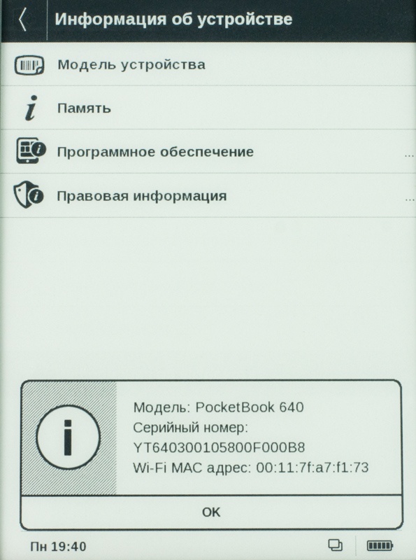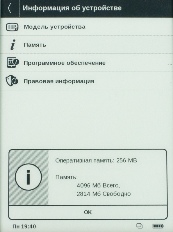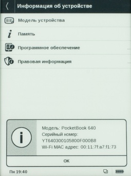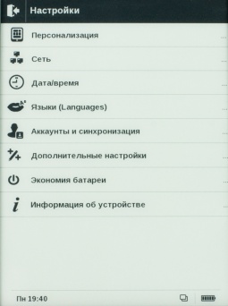 Перейдя в первое вы получите возможность настроить дату и время, выбрать язык интерфейса меню, узнать информацию о ридере, выбрать формат отображения текста, период обновления страницы и многое другое.