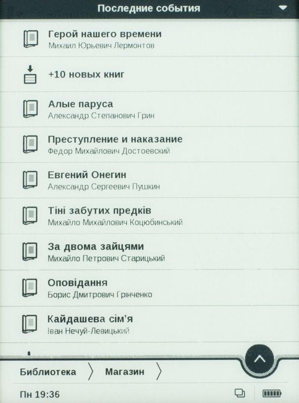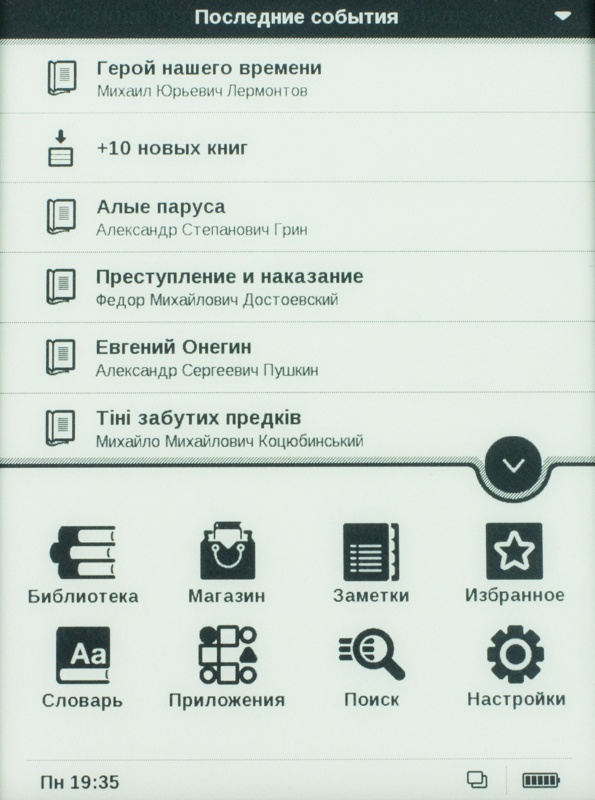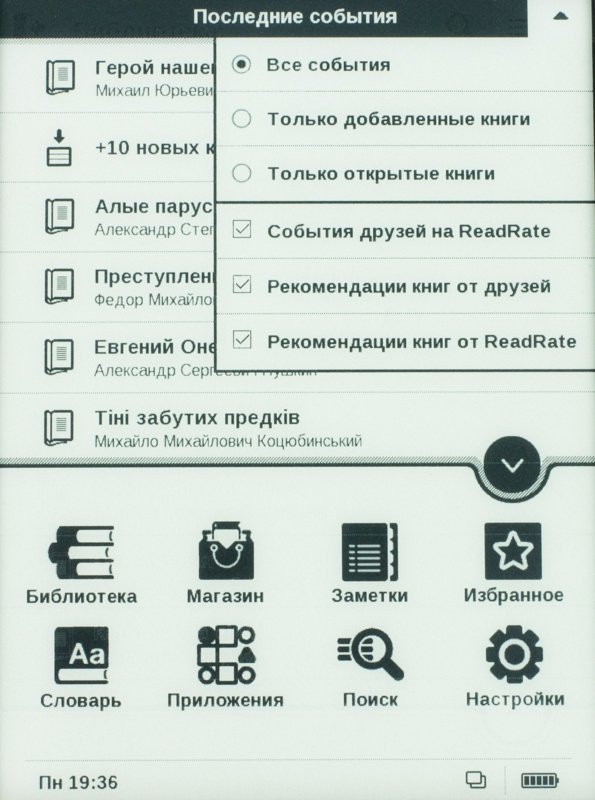 Меню ридера состоит из восьми пунктов, а также панели «Последние события». Она обладает неким контекстным меню - фильтром по этим, скажем так, состоявшимся действиям. Перейдя сюда, пользователь получит возможность задействовать «просмотр по только что добавленным книгам», «открытым книгам», «всем событиям» и мн. др.