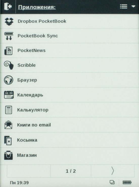 Относительно приложений, то, кроме упомянутого выше Dropbox PocketBook, пользователю доступны PocketBook Sync, Pocket News, «Браузер», «Календарь», игра «Косынка», а также приложение «Фотографии» и пр. В меню последнего можно просматривать фото в форматах Jpeg, BMP, PNG, TIFF. Однако следует помнить, что весь контент такого плана будет отображаться в черно-белом формате.