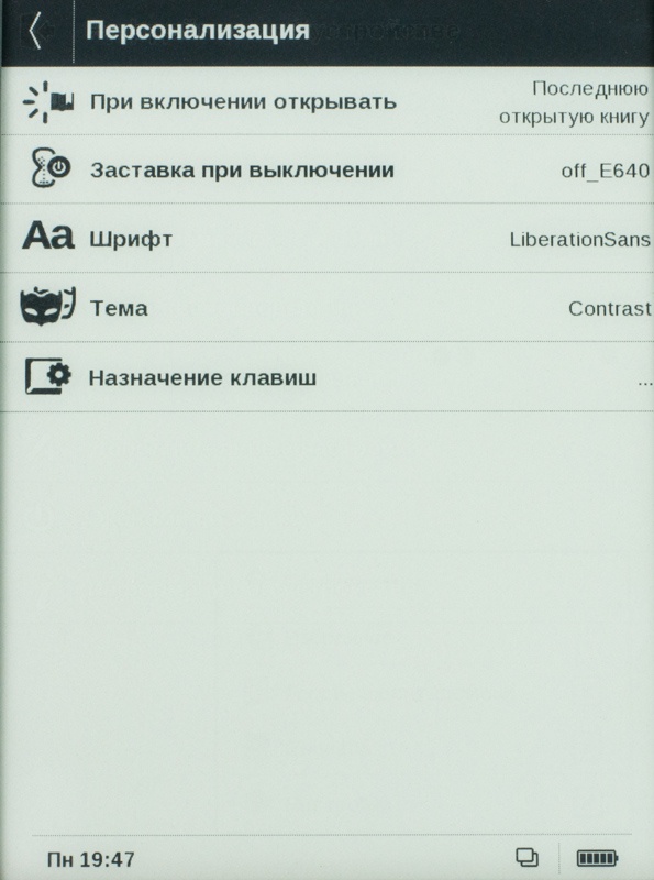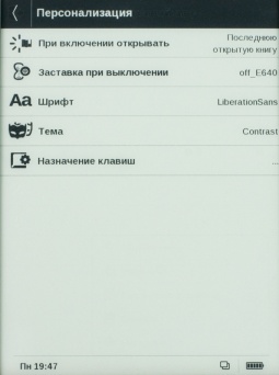 Возвращаясь в «Настройки», несколько слов следует сказать о пункте «Персонализация». Отсюда имеется возможность «подсказать» системе, что следует делать при включении питания - открывать меню либо последнюю книгу, выбрать заставку и шрифт плюс тему рабочего стола и пр.