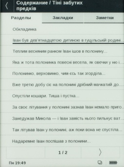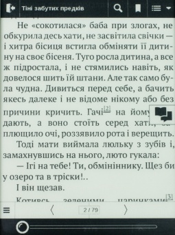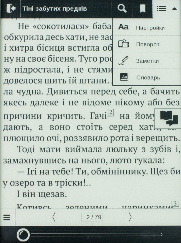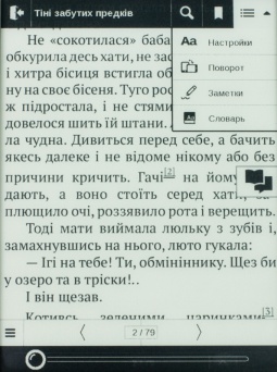 Во время чтения в одно касание по сенсорной панели вызывается контекстное меню. Здесь пользователь может создать закладку, осуществить поиск по тексту, сменить формат развертки, воспользоваться словарем и пр. Можно также вполне удобно настроить шрифт книги, выбрать шаг изменений шрифта, а также межстрочное расстояние и мн. др.