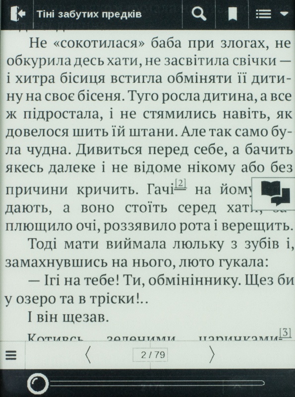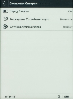 Емкость встроенного аккумулятора 1300 мАч. Производитель заявляет, что одного полного заряда будет достаточно на 8000 страниц чтения. На практике ввиду понятных причин я не смог подтвердить сказанное официально. Однако недельное перечитывание любимого романа в режиме нескольких часов в день «сумело» уменьшить запас батареи на одно деление из пяти, отображенных на специальном ярлыке.