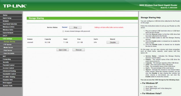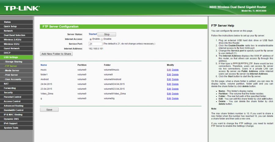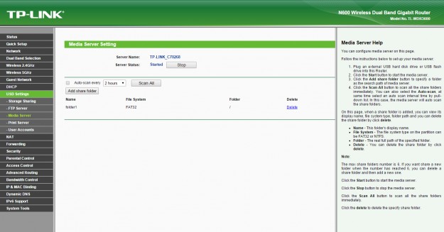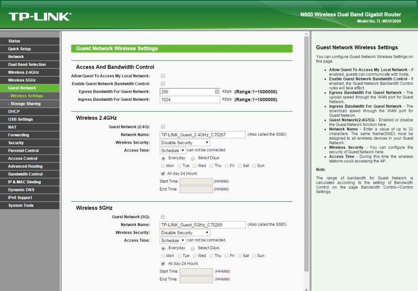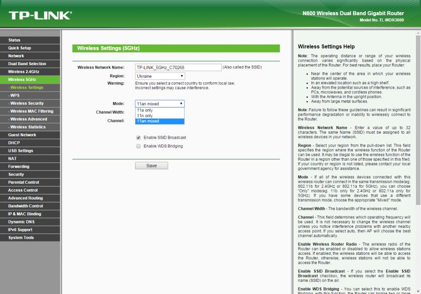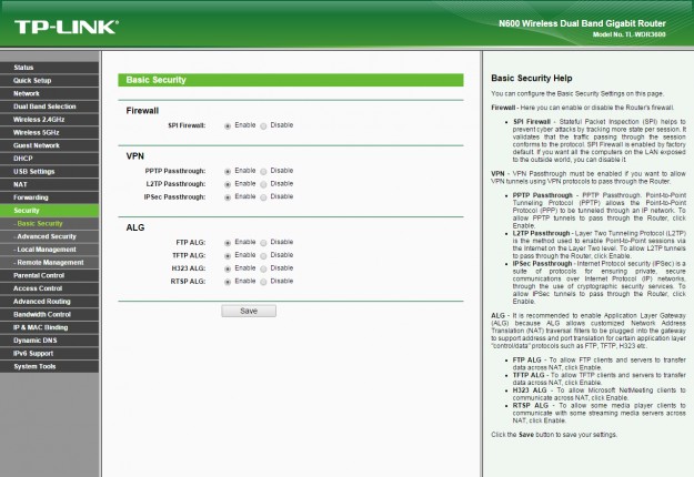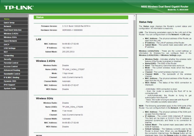 КорпусТестируемый маршрутизатор, если не углубляться в его аппаратную начинку, выглядит стильно и может занять место не только в небольшой офисной беспроводной инфраструктуре, но и претендовать на кандидата в домашнееиспользование. Габариты и внешний вид этому способствуют. Корпус выполнен в черной расцветке, используется в основном глянцевое покрытие. Оно маркое, но не требует постоянного ухода за собой - такова специфика пользования роутерами. Верхняя крышка разделена на три секции, между которыми предусмотрены небольшие углубления, скрывающие от прямого взгляда вентиляционные отверстия. В дополнение к ним нижняя крышка плотно усеяна отверстиями с аналогичной функциональностью. Тут же вырезано два крючка для крепления устройства на стену. На лицевом торце маршрутизатора разместили десять индикаторов работы с салатовой подсветкой и индекс модели. По части разъемов отметим наличие одного порта WAN 10/100/1000 Мбит/с, 4 портов LAN 10/100/1000 Мбит/с и 2 портов USB 2.0 со своими индикаторами. Рядом с ними на тыльном торце разместились разъем под питание и кнопка его включения/отключения, переключатель вкл./выкл. беспроводной сети, совмещенная кнопка сброса настроек (длинное нажатие) и запуска WPS (короткое нажатие), а также гнезда под антенны. Стоит детальнее уточнить по индикаторам на видимой части роутера. Они могут показывать: наличие питания, состояние системы, активность беспроводных модулей, используемые LAN-порты и передачу данных по WAN, а также работу WPS. Аппаратная составляющаяОснову аппаратной начинки TP-LINK TL-WDR3600 составляют вычислительное устройство на базе SoCAtheros AR9344 с частотой 560 МГц и гигабитный коммутатор AR8327N. Чип уже включает в себя радиоблокWi-Fi AR9340 для работы в диапазоне 2,4 ГГц. Модуль для 5 ГГц установлен отдельно, это чипсете AR9582. Для справки, в тестируемом роутере 128 МБ ОЗУ и 8 МБ встроенной постоянной памяти. Внешние антенны используются модулями одновременно. НастройкаРабота с маршрутизатором начинается с подключения к веб-интерфейсу по адресу http://192.168.0.1. Логин и пароль - admin. Прилагаемый в комплекте диск с ПО пришлось проигнорировать, вставить его в ноутбук без CD-привода возможности не было. Быстрая настройка устройства через веб-панель, описанная в инструкции, также невозможна, она ссылается на уже отключенный домен. Так что делаем все вручную. К слову, панель администратора на английском языке, версия прошивки тестируемого маршрутизатора 3.13.31 Build 130320 Rel.55761n. Первое, что следует сделать в настройках, это выбрать интересующий режим работы. Возможны варианты: только 2,4 ГГц, только 5 ГГц, оба диапазона одновременно. Из стандартных настроек можно выделить шифрование WEP/WPA/WPA2, поддержка Radius, выбор ширины канала, WPS и WDS. Помимо этого пользователь имеет доступ к просмотру статистики, фильтрации по белым и черным спискам MAC-адресов, отделению клиентов локальной сети и подключенных к Wi-Fi. Предусмотрена опция создания гостевой сети. Как показала практика, работа в двух диапазонах не приводит к снижению общей скорости беспроводной Wi-Fi. В полосе 5 ГГц скорость передачи получилась выше. Помимо ширины канала на результаты повлияла большая загруженность частоты 2,4 ГГц в нашем офисном центре. Даже у нас в офисе не все подключенные к маршрутизатору устройства поддерживают IEEE 802.11a/n, а значит, не способны работать с частотами в 5 ГГц. Что уже гово