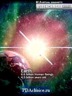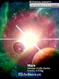 По итогам тестирования, можно с уверенностью говорить, что RoverPC G6 «потянет» большинство роликов и фильмов QVGA и VGA разрешений без предварительной конвертации. Видео с качеством до 2000 кб/сек и разрешением 640x480 пикселей проигрывается без всяких проблем. Тест VSBenchmark 2007. Новый тест, который вы теперь постоянно будете видеть в наших обзорах. Программа тестирует графику с помощью прогона графической сцены с солнечной системой, затем тестирует компоненты коммуникатора, скорость обработки JPEG изображения большого разрешения и воспроизведение звука.