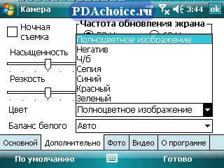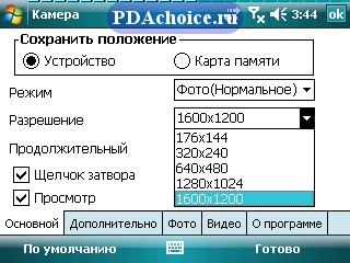 Мультимедиа RoverPC G6О громкости внешних динамиков, расположенных под экраном, я уже сказал чуть выше. Почти то же самое можно сказать и о разговорном динамике. Запаса его громкости будет хватать почти всегда. Например я, чаще всего, разговаривал, выставив 50 % от максимальной громкости и не испытывал при этом проблем со слышимостью. Виброзвонок не слишком сильный. Его можно почувствовать, если носить коммуникатор в карманах. При ношении в чехле вибрация уже не так заметна. В коммуникаторе используется 2 мегапиксельная камера. Также есть вспышка и зеркальце. Объектив камеры не имеет шторки или другого защитного элемента, но как я уже сказал, за счет утопленности окошка камеры в корпус, повредить его почти нельзя. В настройках фото на выбор доступны несколько разрешений (176x144, 320x240, 640x480, 1280x1024, 1600x1200). Также можно выбрать качество снимков (хорошее, лучшее, отличное), баланс белого (авто, солнце, облака, помещение, люминесцент) и эффекты (негатив, черно-белое, сепия, синий, красный, зеленый снимок).