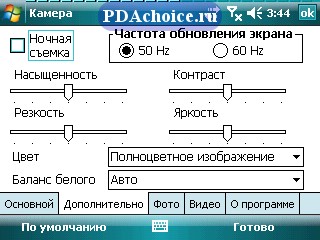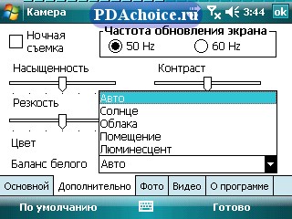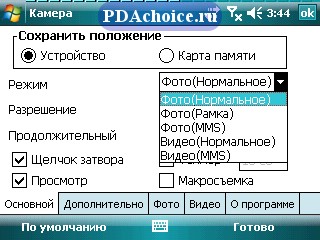 Помимо основных параметров можно изменить насыщенность, резкость, яркость и контрастность изображения, а также выбрать один из режимов съемки (фото, фото с рамкой, фото для MMS).
