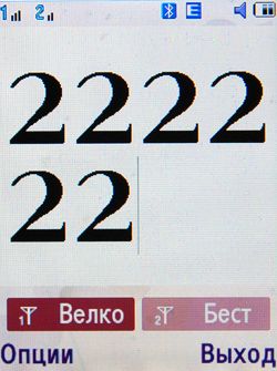 В меню можно настроить действие, которое будет осуществляться при нажатии клавиш громкости во время звонка. Они могут или отключать звук, или отправлять произвольное SMS-сообщение. В журнале звонков отображается информация о том, с/на какую карту были совершены звонки, в памяти какой карты находится абонент. Работа с Bluetooth реализована идеально. Поддерживается огромное количество профилей, есть возможность установки присланного по Bluetooth Java-приложения (при наличии комплекта файлов Jar и JAD). • Dial Up Networking Profile Передача данных происходила на скорости порядка 130 КБ/с. Это хороший показатель. Пользователь получает в свое распоряжение около 27 МБ в памяти телефона. Карты памяти в комплекте нет. Качество плеера и звука находится на уровне Samsung G600 и Samsung U600, поэтому повторяться не будем. Голосовой набор отсутствует. Уровень SAR для данной модели — всего 0,219 Вт/кг. В Европе допустимое значение составляет 2 Вт/кг, в США — 1,6 Вт/кг. В телефоне установлен аккумулятор емкостью 1200 мАч. В условиях плохого приема при небольшом количестве звонков и SMS устройство стабильно работает два дня. Средний показатель при умеренном использовании — 2—3 дня. Камера