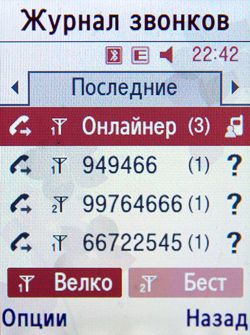 Samsung обещает прием до 4 звонков одновременно, но на деле этого не происходит. Одновременно показывается только один звонок. Второму звонящему отсылается сигнал «занято», а на DuoS оказывается только один пропущенный вызов — того абонента, который начал звонить первым. После настроек ожидания вызова второй пропущенный звонок тоже начал отображаться. Однако одновременно все равно виден только звонок на одну SIM. Возможно, это ограничение конкретной прошивки. Мы это выясним и дополним материал. Хотя инженерный образец D880, который побывал у нас в офисе ранее, вел себя точно так же. Далее из раздела любопытных экспериментов: что будет, если с одной SIM-карты позвонить на другую? Ничего необычного — сигнал «занято». SMS с одной карты на другую отправляются, здесь ничего удивительного. Выше мы упоминали о выделенной клавише смены активной SIM-карты. Эта кнопка требуется при совершении звонка, отправке сообщений или выставления уникальных для каждой карты настроек. В каждом из этих случаев внизу появляются картинки, показывающие активную карту. Активация второй карты происходит мгновенно без каких-либо задержек вместе со сменой активных профилей для WAP/MMS/E-mail. Режим передачи данных и MMS всегда доступен только для активной SIM-карты. При установке новых SIM-карт телефон предлагает выбрать для каждой из них уникальное название. К сожалению, предлагается всего 5 букв («Велко» вместо «Велком» на скриншотах). Для каждой карты можно установить уникальную мелодию звонка, что очень удобно. Для SMS подобной опции нет.