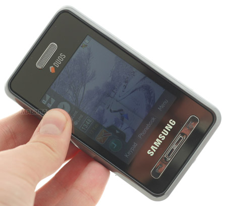 Обзор Samsung D980 DuoS: «Бизнес на двоих»Dual-SIM для бизнес-аудитории, с интересным динамическим интерфейсом, сенсорным дисплеем и нестандартным дизайном — это все новый Samsung D980 DuoS. Считаете, что телефоны на две SIM-карты предназначены только для того, чтобы экономить на связи? — Возможно это и так, но не всегда. Поскольку есть сегмент пользователей, у которых несколько активных «симок» не по их собственной прихоти, а, к примеру, по долгу службы. Пример можно привести банальнейший — Вы приходите на новую работу, где выдают корпоративную SIM-карту и Вы просто обязаны ею пользоваться во всех рабочих процессах. Но что делать с тем номером, что использовался ранее? Его ведь не выбросить, да и все личные контакты закреплены за прежним номером. Использовать два телефона неудобно, а покупать какой-то недорогой двухсимник не позволят статус, ведь телефон уже давно перестал быть средством связи — в первую очередь, это деталь имиджа, вот в этом случае, и наверное лишь в этом, модель Samsung D980 DuoS и будет интересна. Общая информацияКогда впервые берете в руки модель D980, появляется странное ощущение дежавю, как будто это уже ранее было. И нечего удивляться, поскольку так оно и есть, ведь новый DuoS построен на базе телефона Samsung F480. Причем схожесть видна не только внешне, а и внутренне (помните рекламные борды Samsung F480 со странным словом «виджеты»? — так вот, они есть и в D980 DuoS). Используется та же платформа, тот же набор приложений, если не учитывать возможность последней модели работать с двумя SIM-картами одновременно, то количество различий можно посчитать на пальцах. Но не стоит сразу забрасывать новинку помидорами, поскольку модель F480 зарекомендовала себя позитивно, а значит у D980 есть все шансы стать еще более интересной, за счет технологии DuoS. Размеры аппарата невелики, по сравнению с наметившейся тенденцией к увеличению габаритов, его можно назвать миниатюрным представителем мобильных телефонов. Выдает его лишь толщина, что на общем фоне компактности превращает его в некоторое подобие толстяка. Вес у аппарата небольшой — чуть более 100 грамм, если уж быть точным, то 108, но опять таки, из-за малых габаритов хочется назвать Samsung D980 тяжелым, поскольку подсознательно ожидаешь от компактного устройства меньший вес.