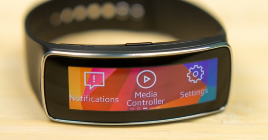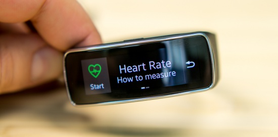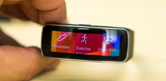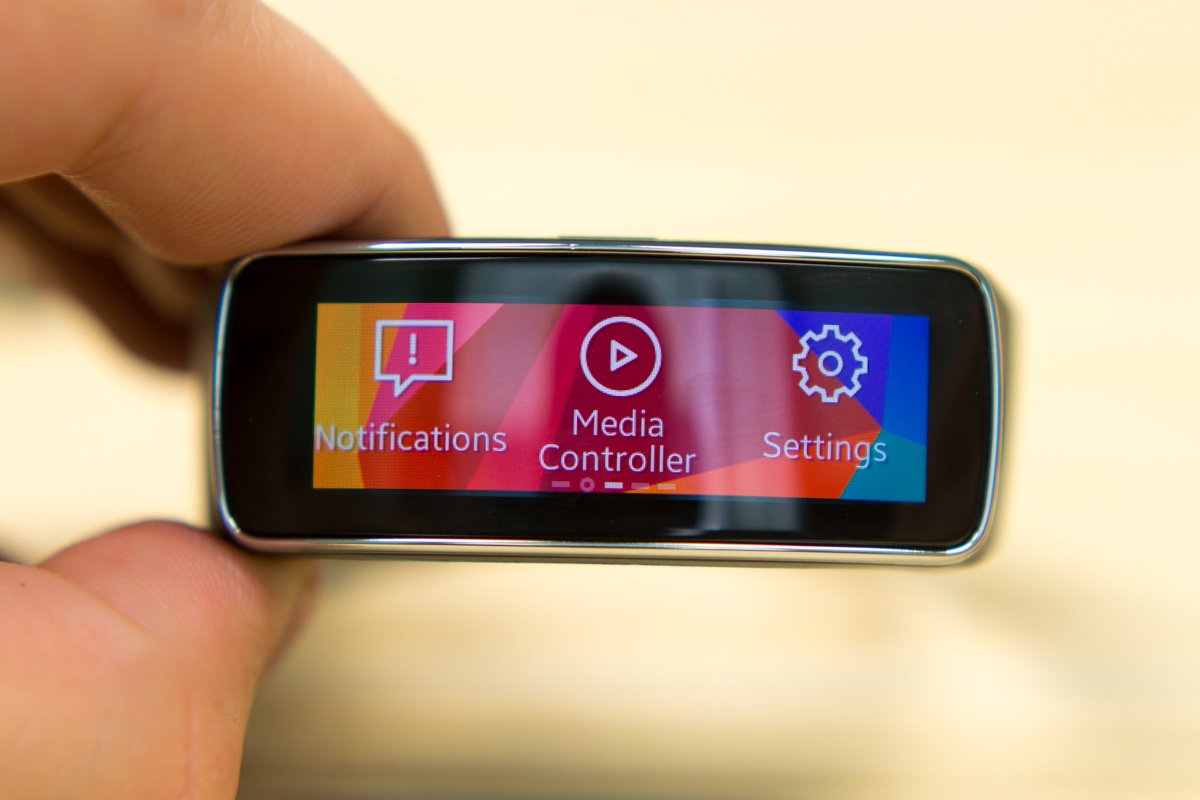 Samsung Gear Fit получил 1,84-дюймовый сенсорный дисплей! В основе AMOLED-матрица. Разрешение 432х128 точек. Углы обзора, как по мне, неплохие.