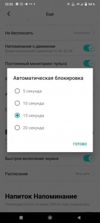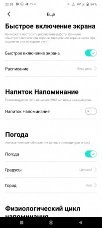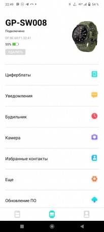Вторая вкладка – смарт-часы и настройка их функций: циферблаты, уведомления от приложений, будильники, съемка с часов, добавление избранных контактов в часы для удобства набора номера и звонков через меню G-WATCH. В расширенном меню второй вкладки можно задать формат времени, напоминания о движении и питье, включить постоянный мониторинг пульса, времени автоматической блокировки, активировать «женские» функции и еще пару мелочей. Подробнее с ними можно ознакомиться на скриншотах ниже.