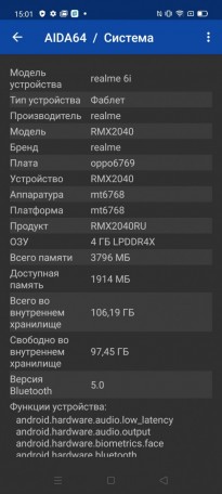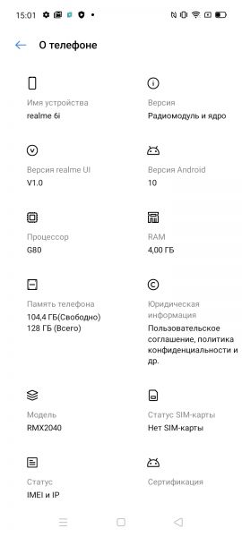 Дисплей Realme 6i – телефон с большим 6,5 дюймовым IPS дисплеем с каплевидной выемкой в верхней части под камеру. Разрешение низкое - 720 x 1600 пикселей, что больше характерно бюджетному сегменту. Защита сверху - Gorilla Glass 3, дополнительно установлена защитная пленка. Картинка на дисплее выглядит ярко и резко. В настройках можно подобрать подходящий лично вам оттенок белого. Запас по яркости невысокий. Диагональ точно мультимедийная. Телефон подойдет тем, кто покупает не просто звонилку, а еще и мультимедийный центр для просмотра видео и кончено же игр. Аппаратная начинка Внутри смартфона чипсет MediaTek Helio G80, по сути игровой процессор, но конечно же не флагманский. Его дополняет графический чип Mali-G52 MC2 и в нашем случае 4 ГБ оперативной памяти. В Antutu они гарантируют отметку в 202 тыс. баллов. Встроенной памяти – 128 ГБ и она расширяется без необходимости экономить на SIM картах. Можете грузить любые игры на этот телефон, но учтите, что настройки по части детализации не будут максимальными. Покупатель может пользоваться связью в сетях до 4G включительно, двух диапазонным Wi-Fi, Bluetooth 5.0, GPS, но NFC не поддерживается. ОС и приложения Программная основа - Android 10 с обновленным интерфейсом Realme UI. Мне достаточно того, что он позволяет выбрать иконки на свое усмотрение и активировать Smart Sidebar. С помощью последней можно настроить быстрый запуск часто используемых функций и приложений. Мультимедийные программы, такие как Галерея, Музыка и Видео – собственной разработки Realme. По сути на этом список приложений, не имеющих отношения к Google, закончен. Остальное качаем из Play Market, сервисы Google, в отличии от Huawei работают на Realme 6i без ограничений. Батарея В Realme 6i батарея на 5000 мАч. Телефон поддерживает быструю зарядку 18 Вт. В комплекте соответствующее зарядное устройство. Если смотреть видео и включить все беспроводные модули, выкрутить подсветку и звук на максимум, то Youtube будет забирать по 1% заряда каждые 6 минут. А значит за час заряда станет ан 10% меньше. В итоге видео можно без перерыва смотреть 10 часов, не ограничивая себя ни в чем. В цифрах это зарядка 50% за 50 минут. Не совсем быстро, но на уровне аналогово от Xioami, чего и стоило ожидать в этом ценовом сегменте. Камеры На тыльной панели блок из четырех камер: