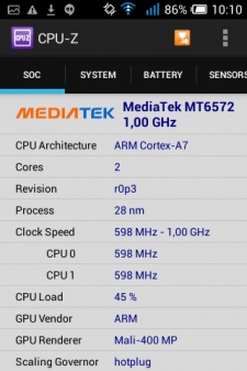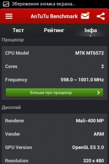 Создан аппарат на базе 2-ядерного процессора MediaTek MT6572 с тактовой частотой 1 ГГц и графикой Mali-400MP.