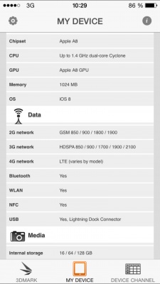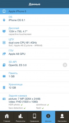 Объем оперативной памяти — 1 ГБ. Оснащение и производительностьНовое поколение смартфона Apple по традиции получило новое «железо» — чип Apple A7 сменил куда более мощный и энергоэффективный 64-битный 2-ядерный A8 с тактовой частотой 1,4 ГГц, 6-ядерной графикой PowerVR GX6650 и сопроцессором движения M8. Последний предназначен «освободить» А8 от выполнения простых задач — в первую очередь от обработки данных о действиях пользователя, получаемых от датчиков.