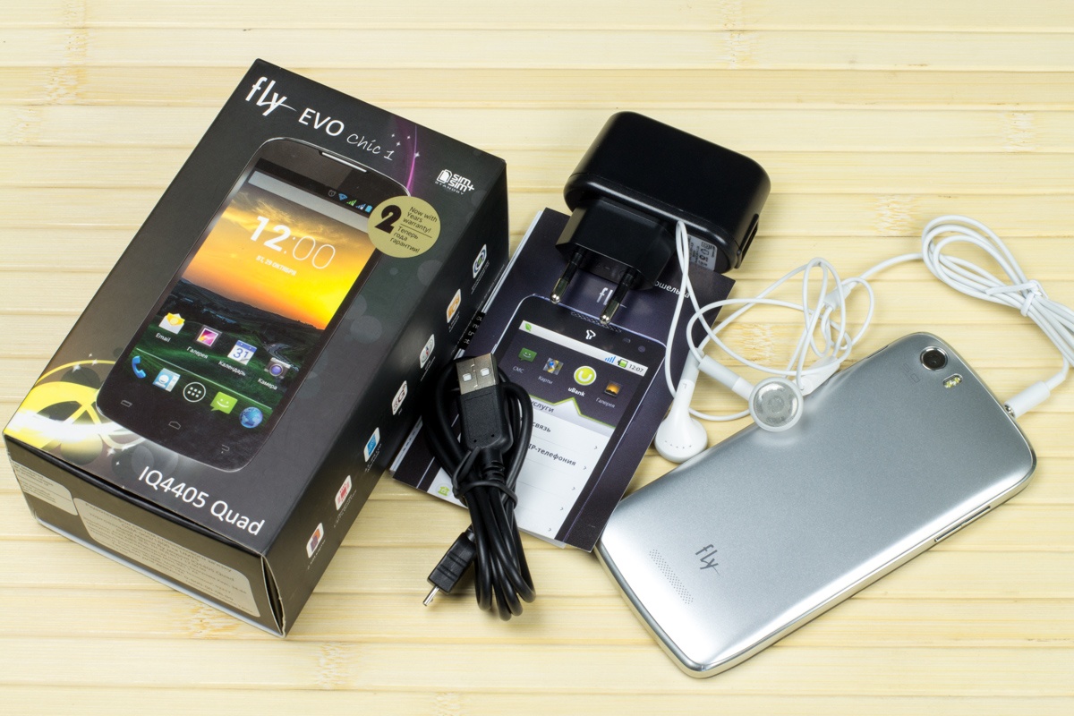 Обзор смартфона Fly Evo Chic 1 IQ 4405 Quad — доступный шик!Презентабельный внешне представитель бюджетного сегмента с 4.5-дюймовым IPS-дисплеем, 4-ядерным процессором, а также аккумулятором на 1800 мАч и поддержкой двух SIM-карт. О том, что еще можно зачесть в плюсы 120-долларового Fly Evo Chic 1, и что производителю неплохо было бы в нем доработать, говорим далее. Комплектация