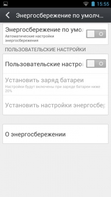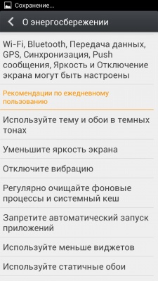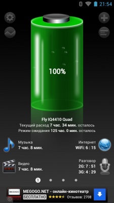 Стоит также добавить, что в меню Fly IQ4410 предусмотрен специальный режим «Энергосбережение», настроив который, пользователь может ограничивать потребление энергии аккумулятора, когда уровень заряда его дойдет до определенной отметки.