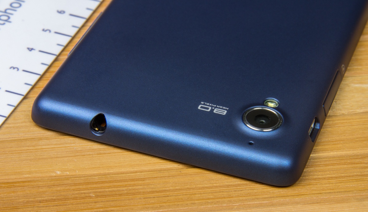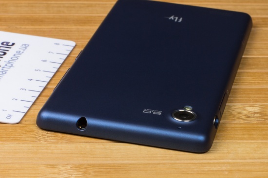 В теле тыльной панели имеется вывод глазка основной 8 Мп камеры, а также светодиодной вспышки. Кроме того, здесь же расположен микрофон шумоподавления плюс сетка динамика громкой связи.