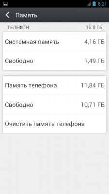 Официально в смартфоне 16 ГБ встроенной памяти, однако пользователю доступен не весь объем, а немного меньше 12. Расширить его за счет карт памяти не получится - соответствующий слот не предусмотрен. USB OTG сопряжение также не поддерживается.