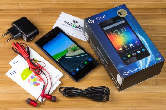 Остальные аксессуары в коробке Fly Coral - адаптер зарядного устройства, кабель micro-USB/USB, а также необходимая документация.